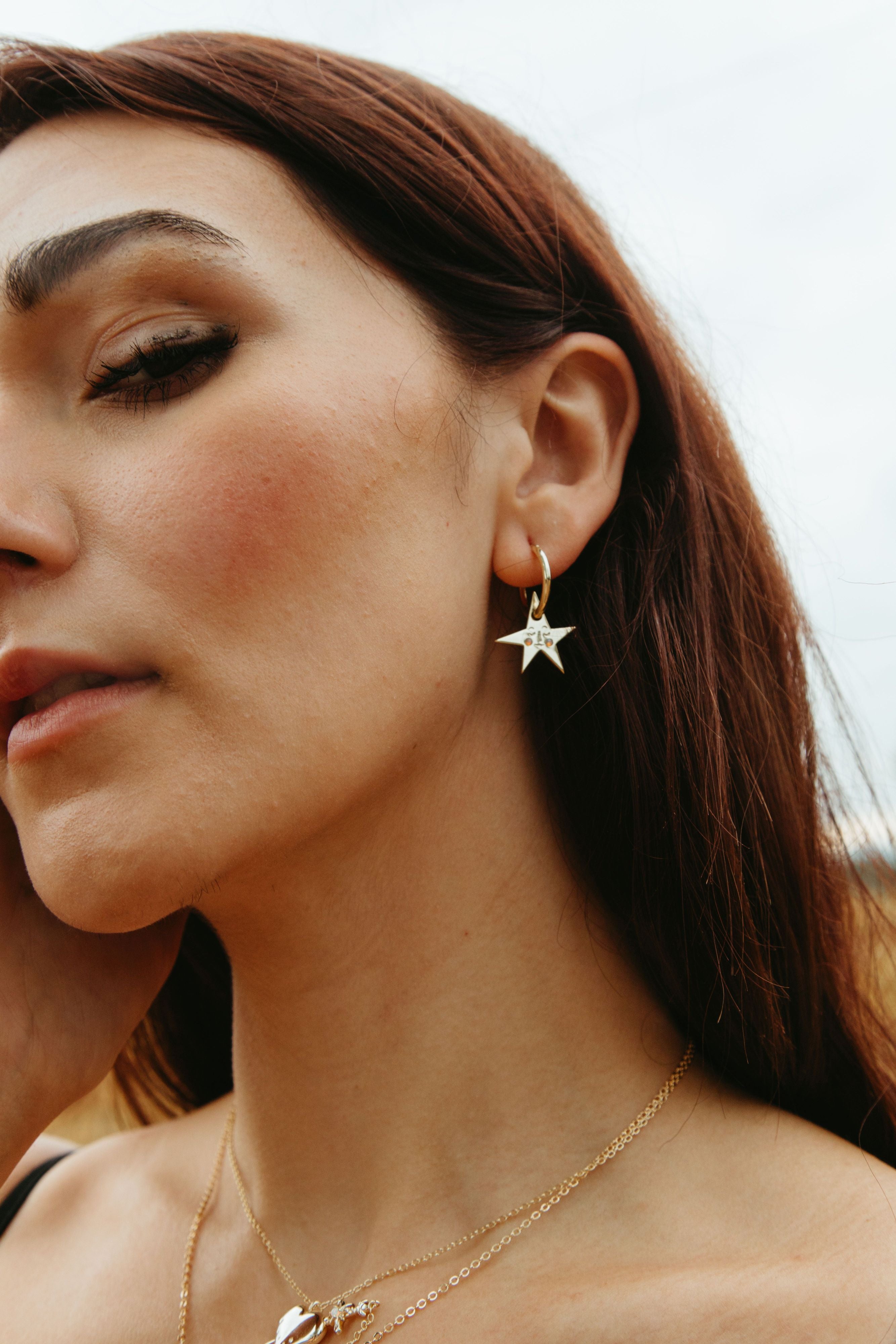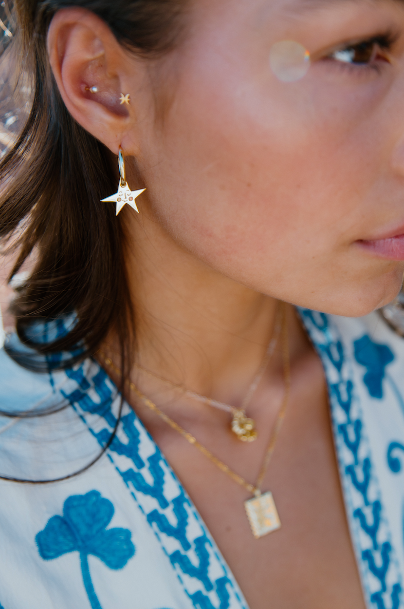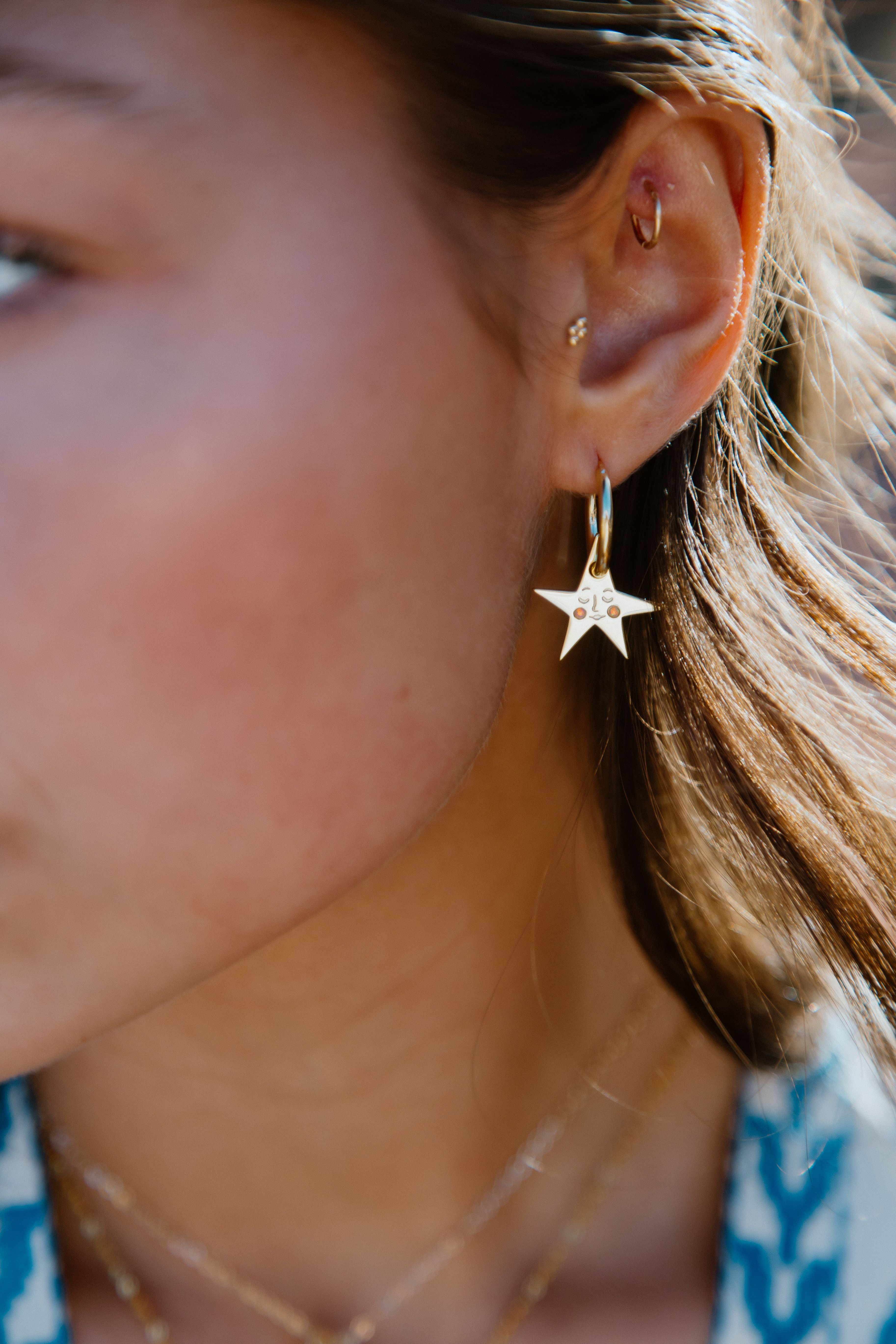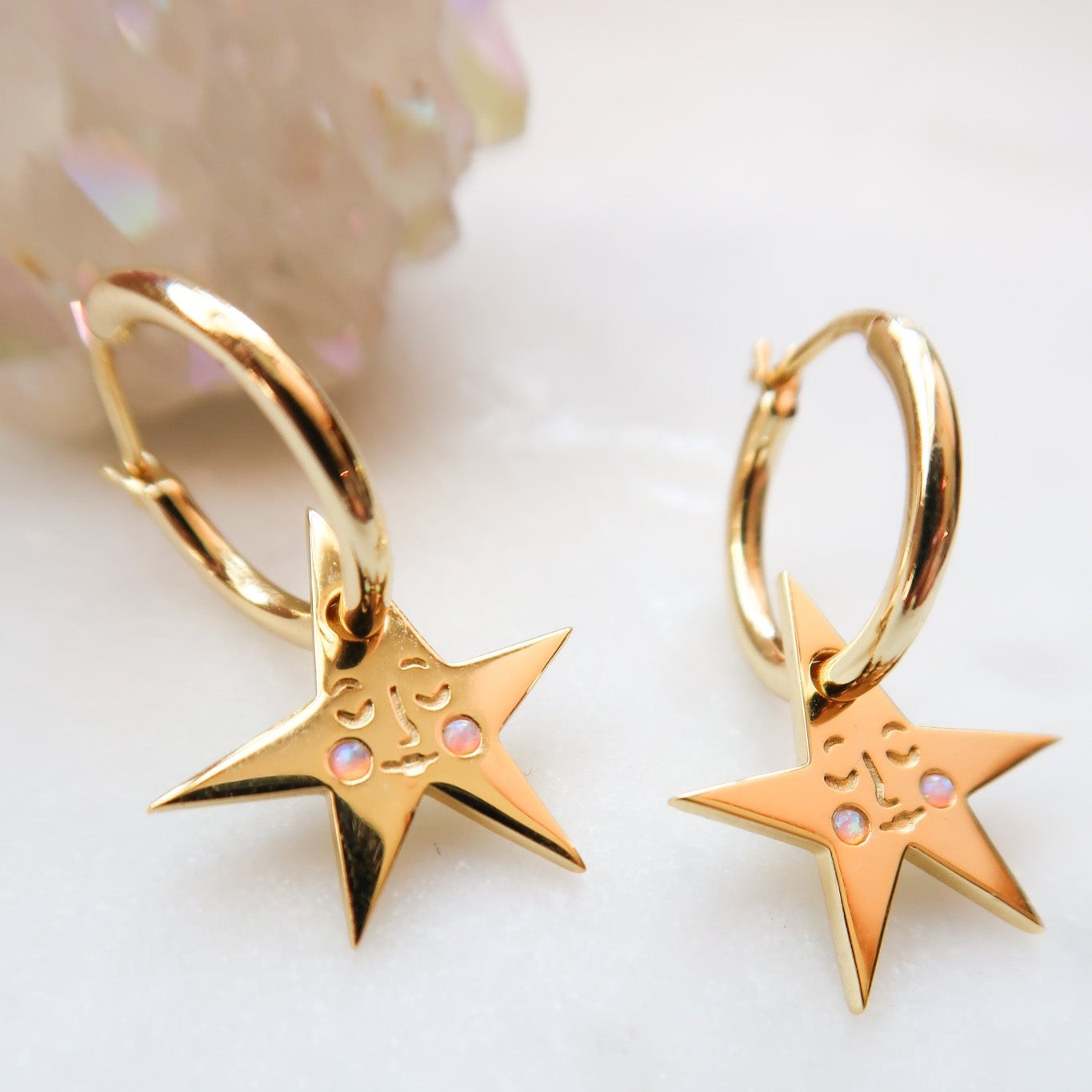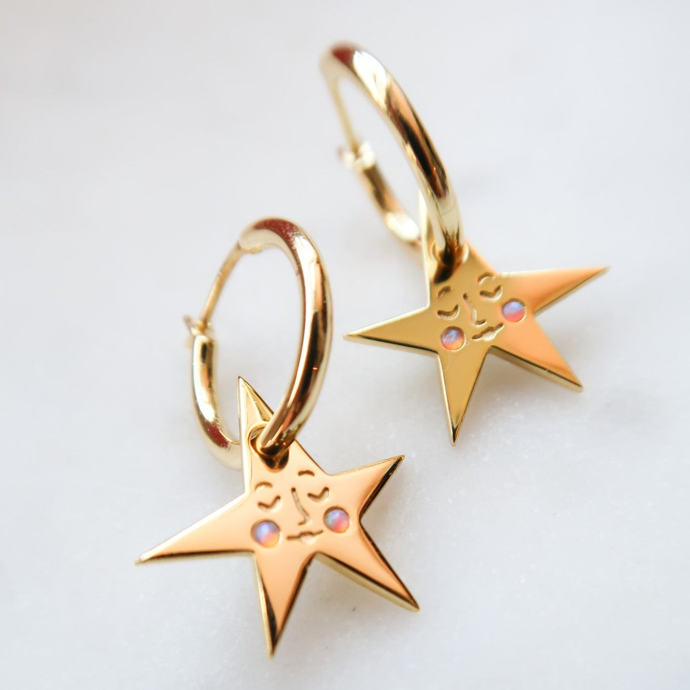 These Blushing Star Hoop Earrings feature gold-plated sterling silver hoops with star-shaped charms that blush with opal-adorned cheeks, the perfect detail to make an everyday earring special. Inspired by a story of a star that blushed every time the moon looked its way, these earrings remind you to embrace your unique glow.