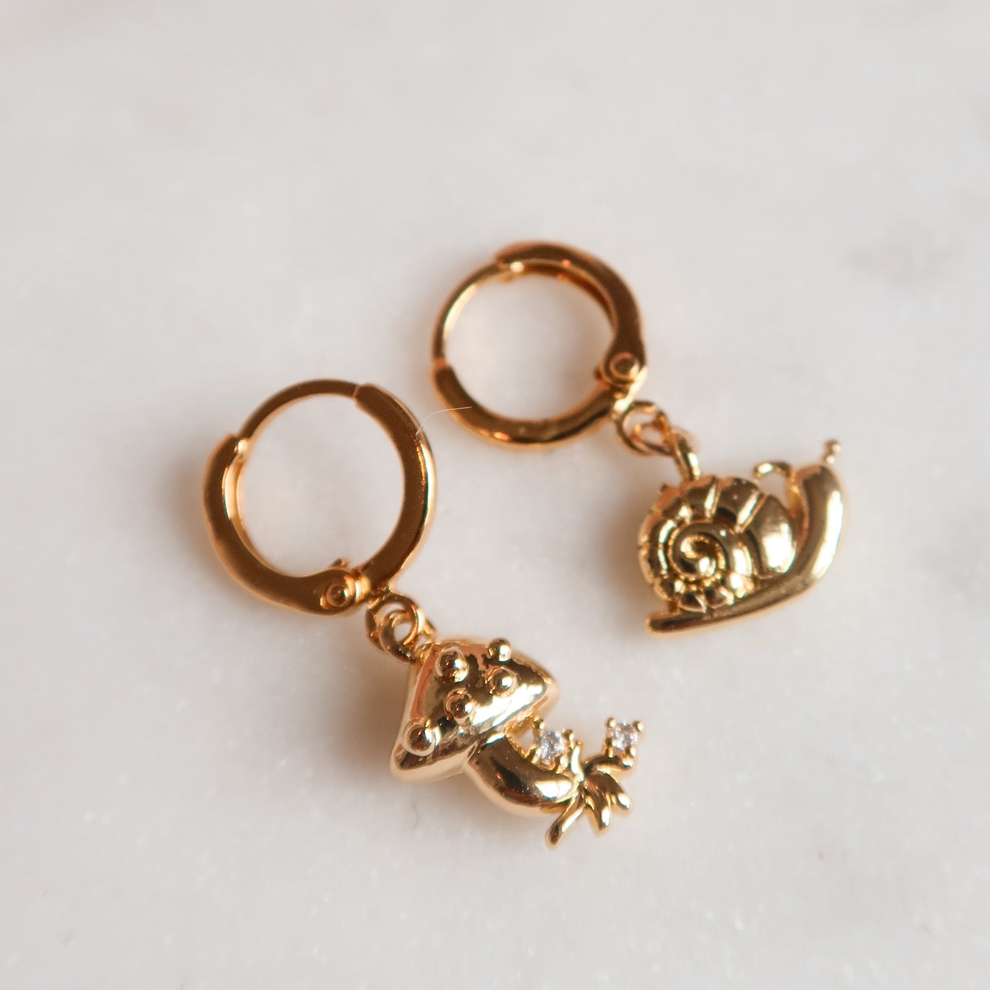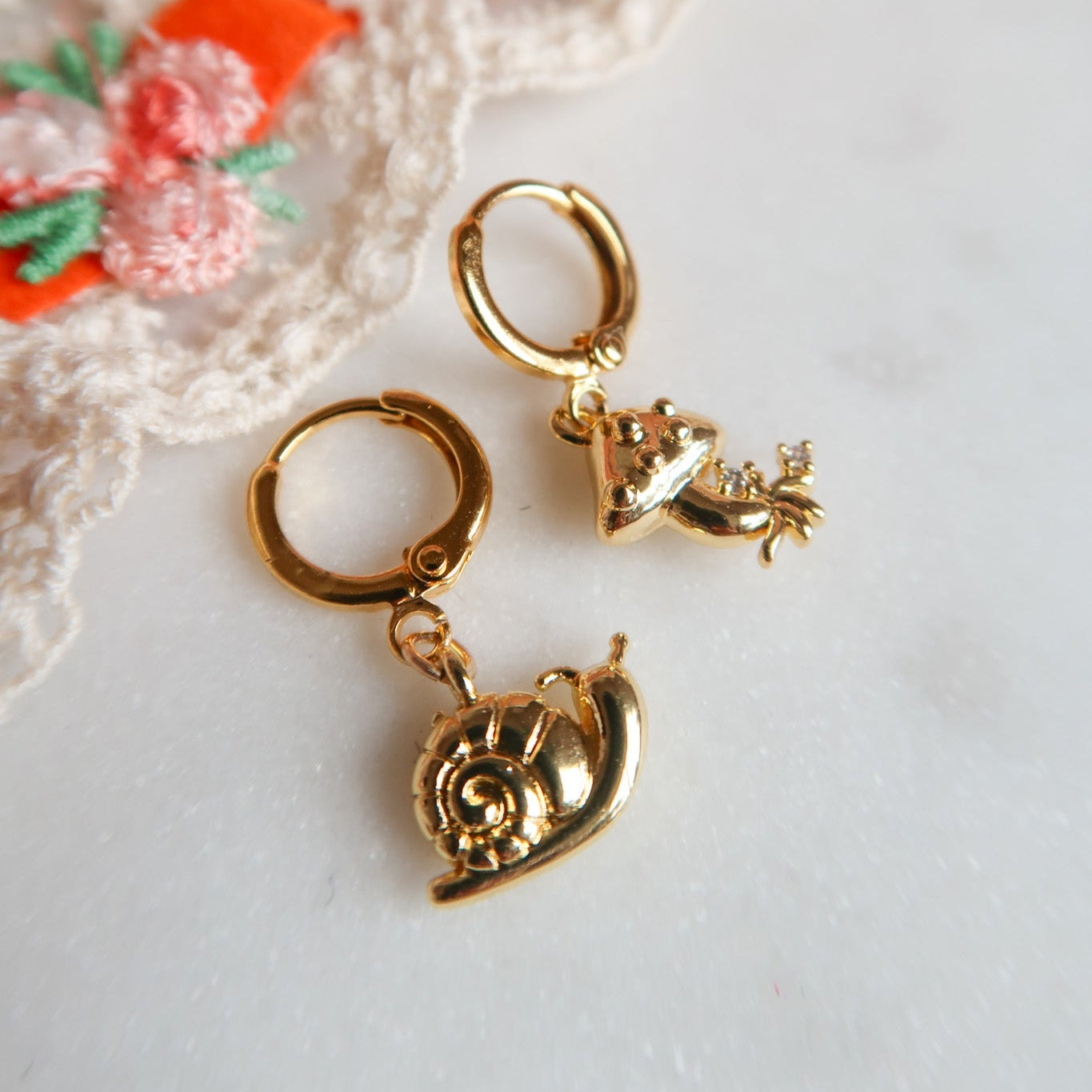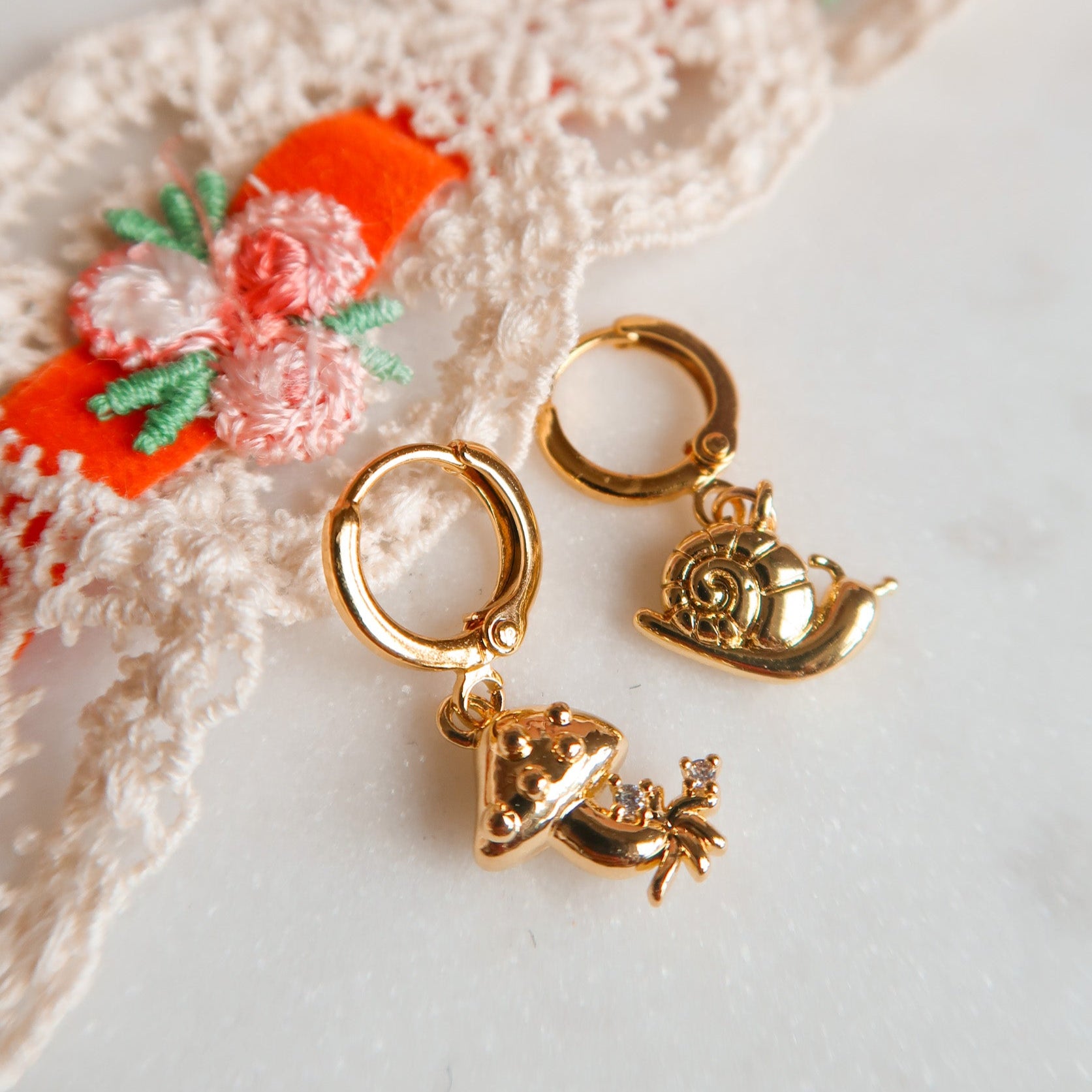 The Tiny Voyager Earrings are a celebration of adventure, whimsy, and the joy of carrying friends through life’s little journeys. Crafted in gold filled, these asymmetrical earrings feature a delicate snail and a miniature mushroom, inspired by the scene where Franklin the turtle gives the snail a ride to the party and the playful spirit of tiny, magical voyages. Perfect for dreamers and wanderers, Tiny Voyager captures the sweetness of small adventures, the charm of unexpected companionship, and the wonder of seeing the world from a tiny perspective, making them a statement piece for imaginative hearts and whimsical souls.