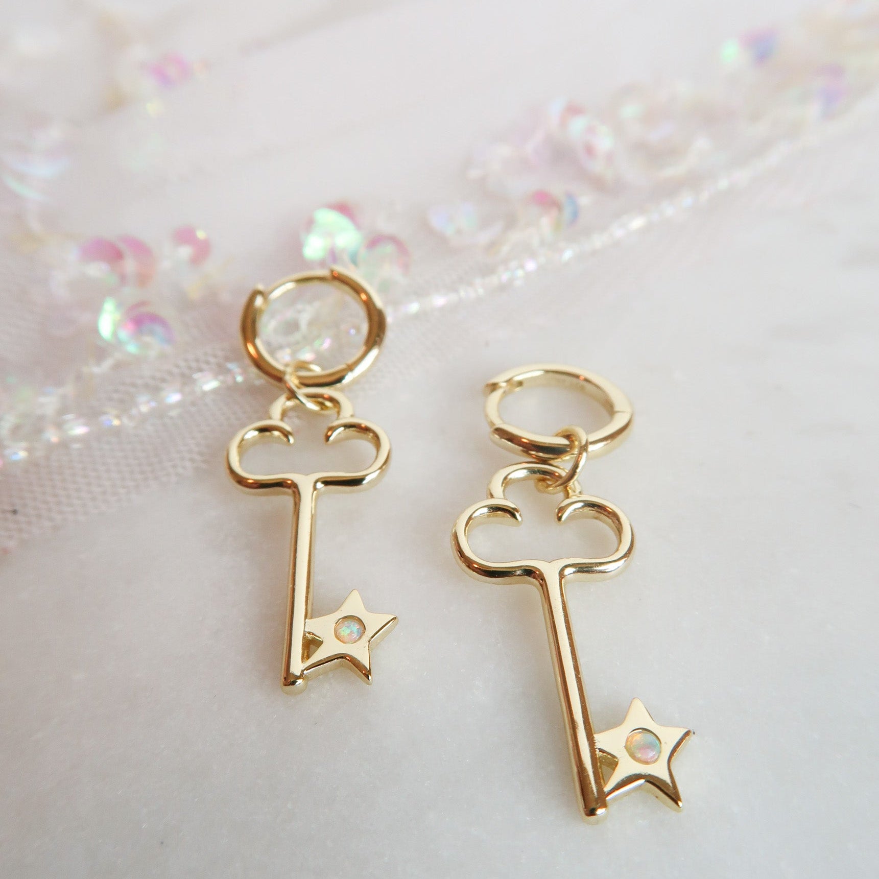 • 14k Gold Plated Sterling Silver Opal Star Key Huggie Earrings