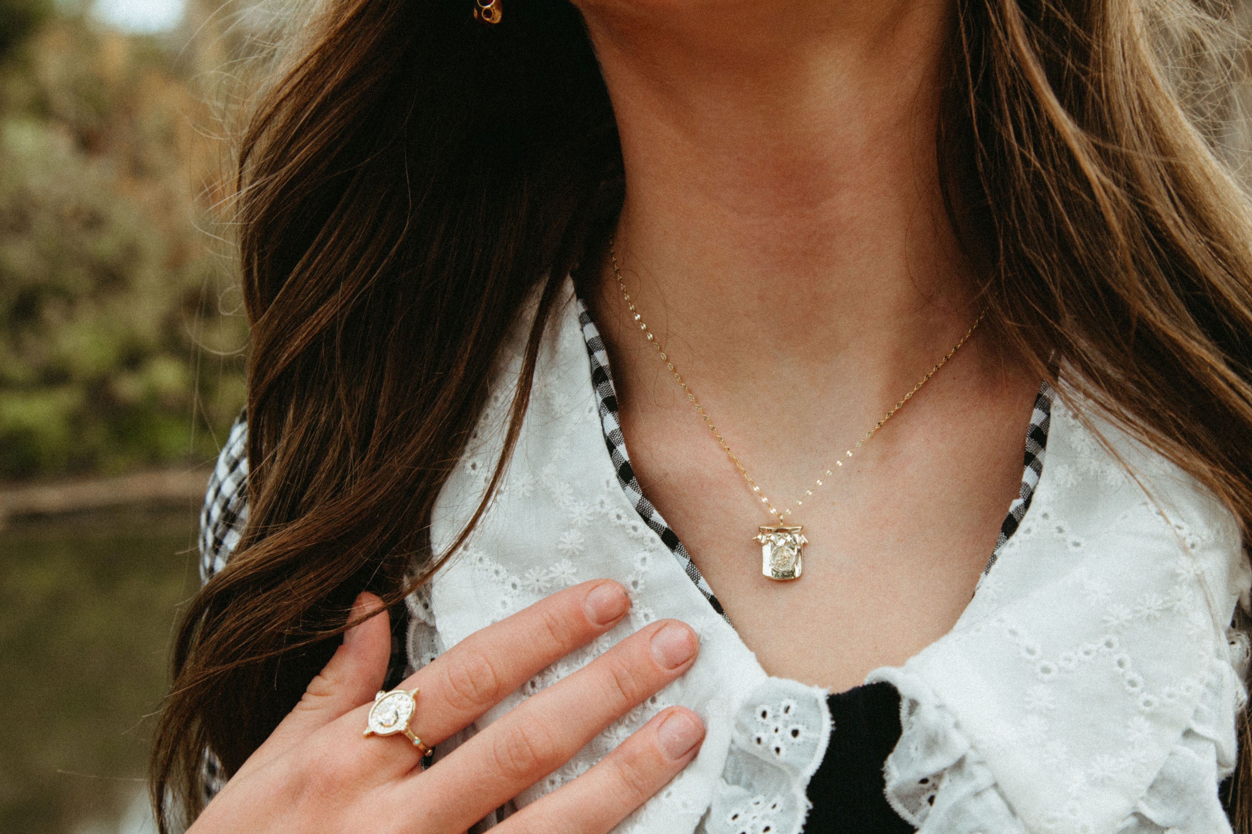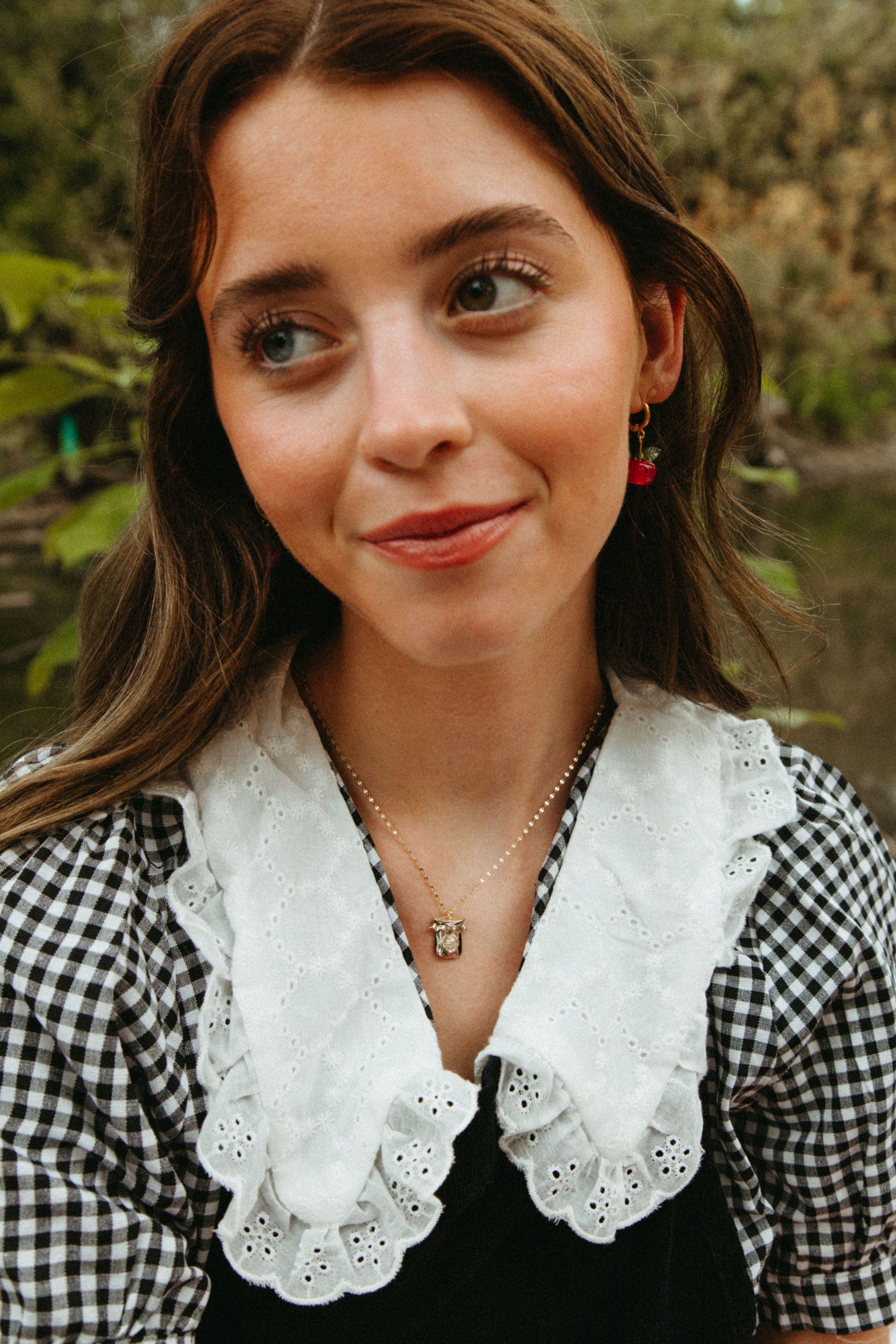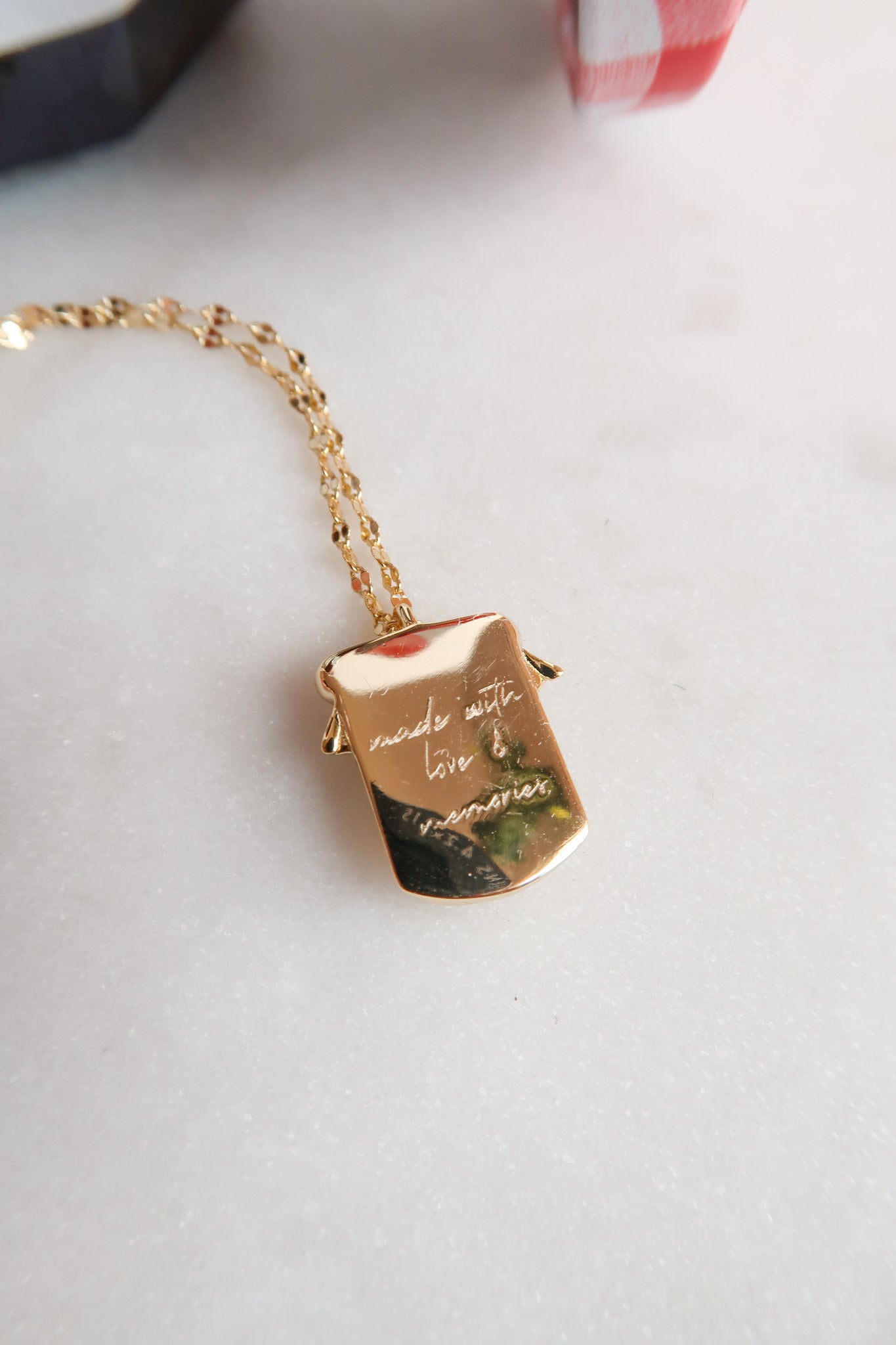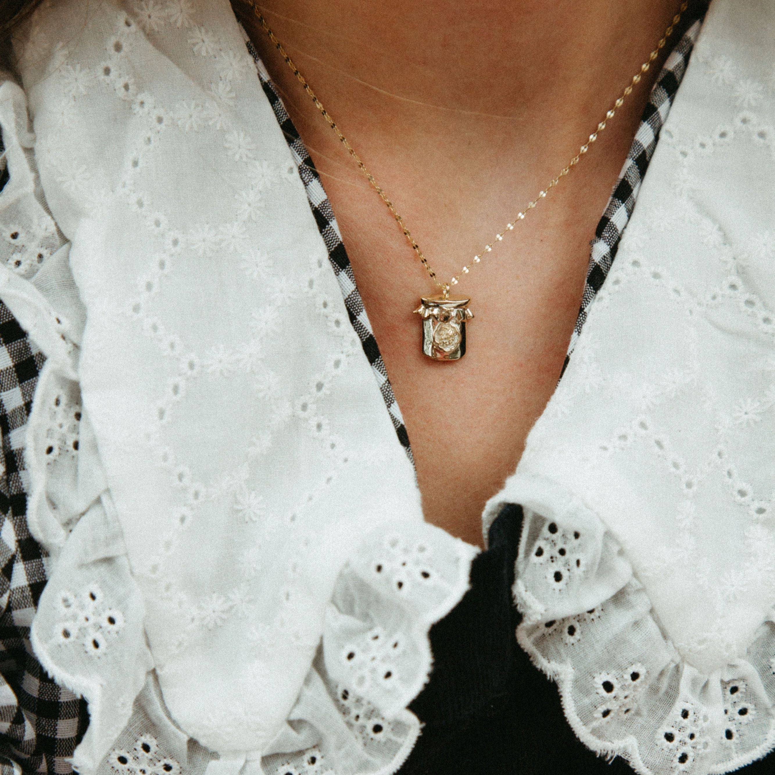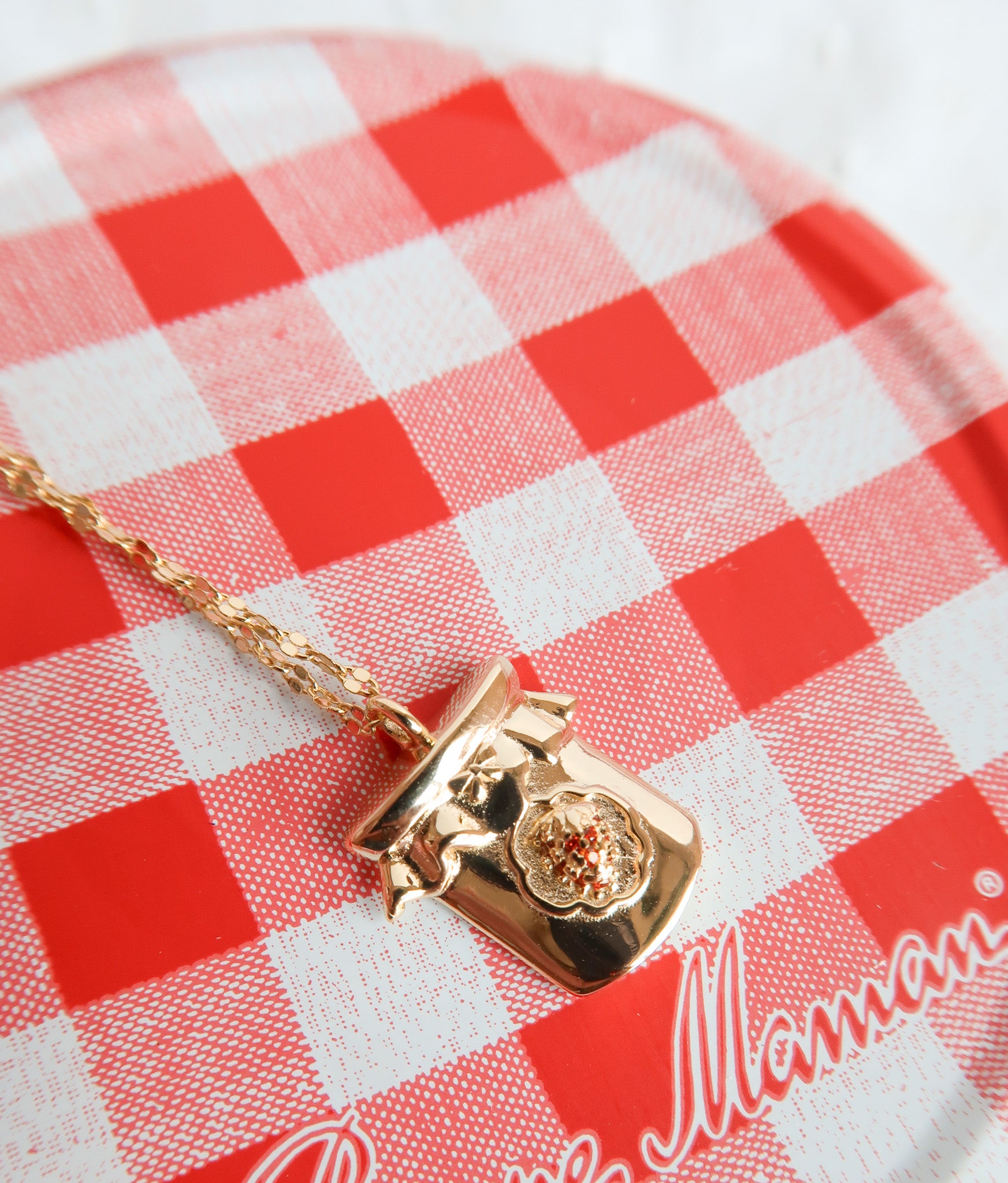 The Made With Memories Necklace is a love letter to baking with your grandma, laughter that lingers like sunlight, and the sweetness of moments bottled up in time. Featuring a dainty strawberry jam jar charm engraved on the back with “made with love and memories,” this whimsical necklace captures the nostalgia of homemade sweetness and the warmth of love preserved through the years. Made With Memories is perfect for tender hearts who find poetry in the everyday, who carry stories close to their chest, and who believe the simplest things often mean the most.