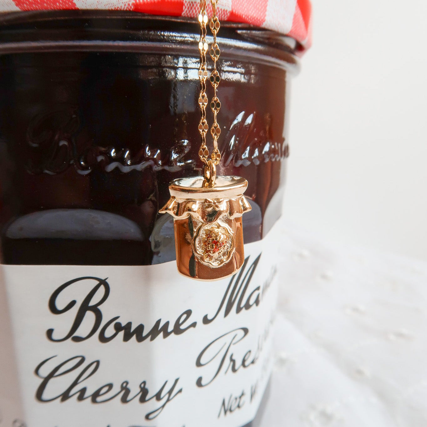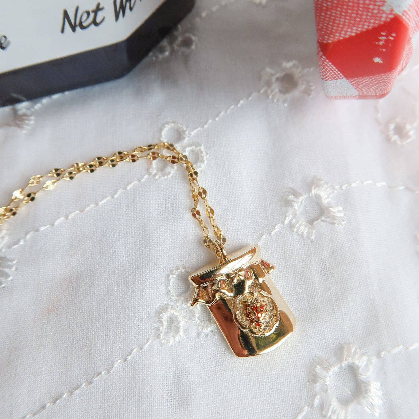 - 14k Gold Plated Sterling Silver Strawberry Jam Jar Necklace: 14" with 3" adjuster links