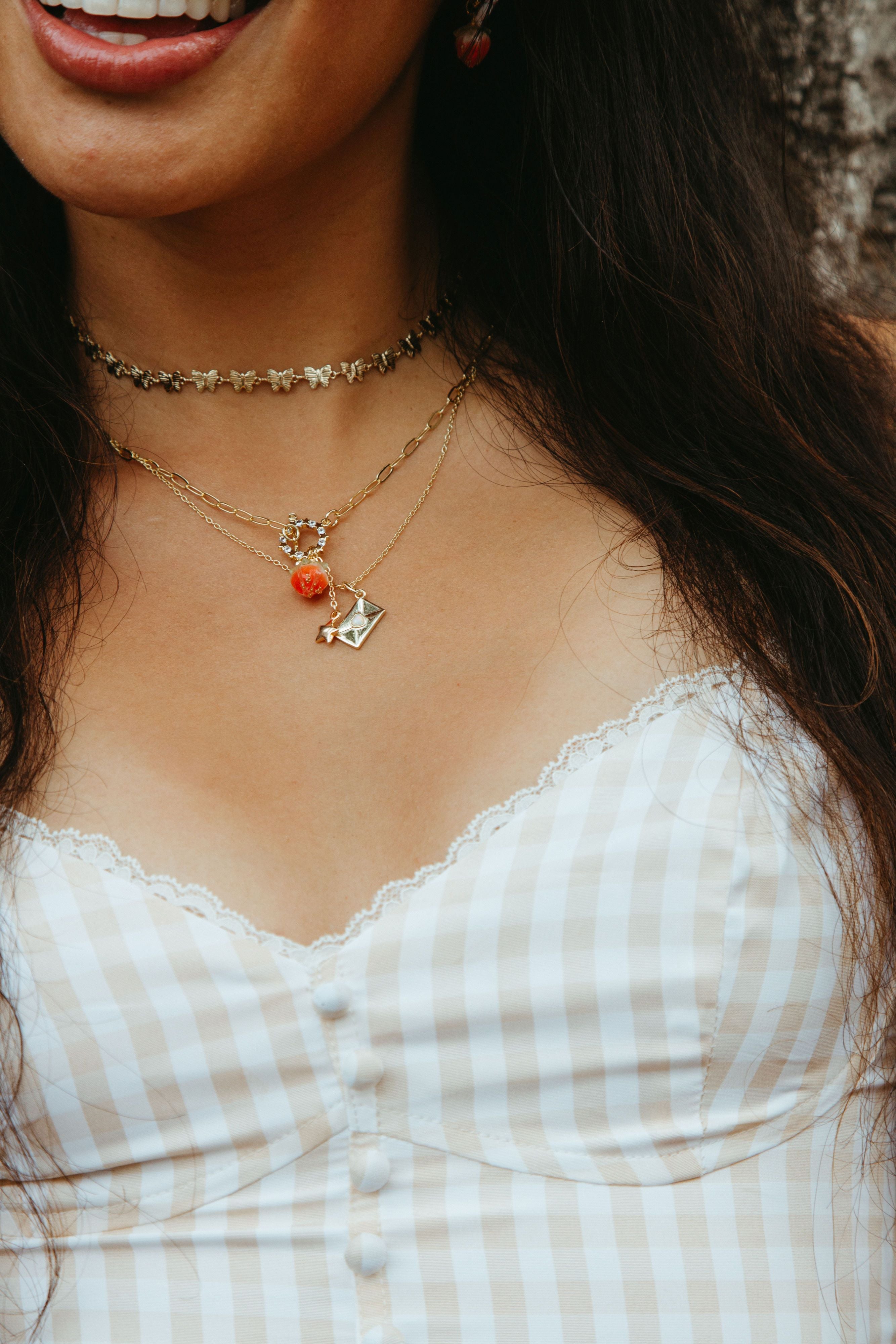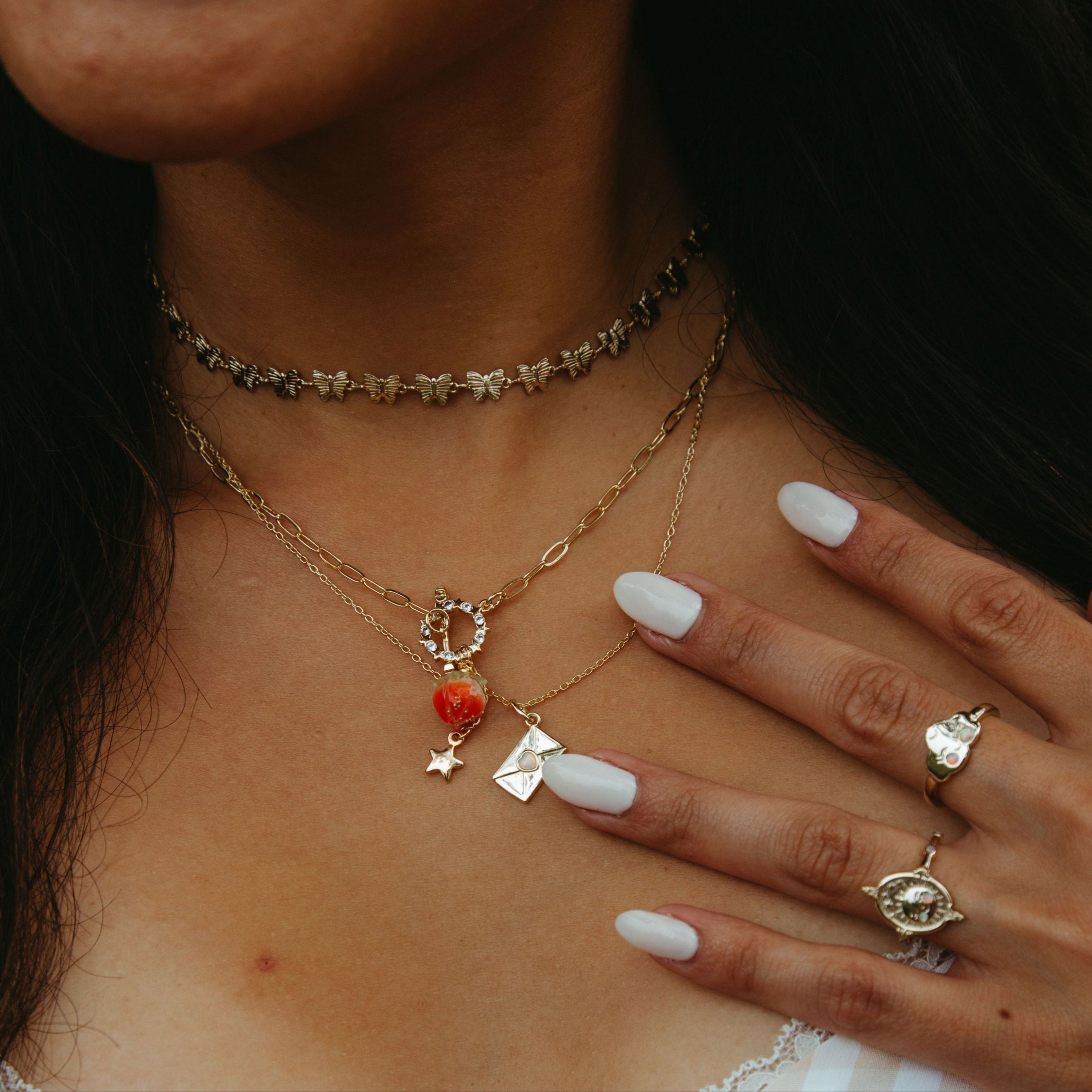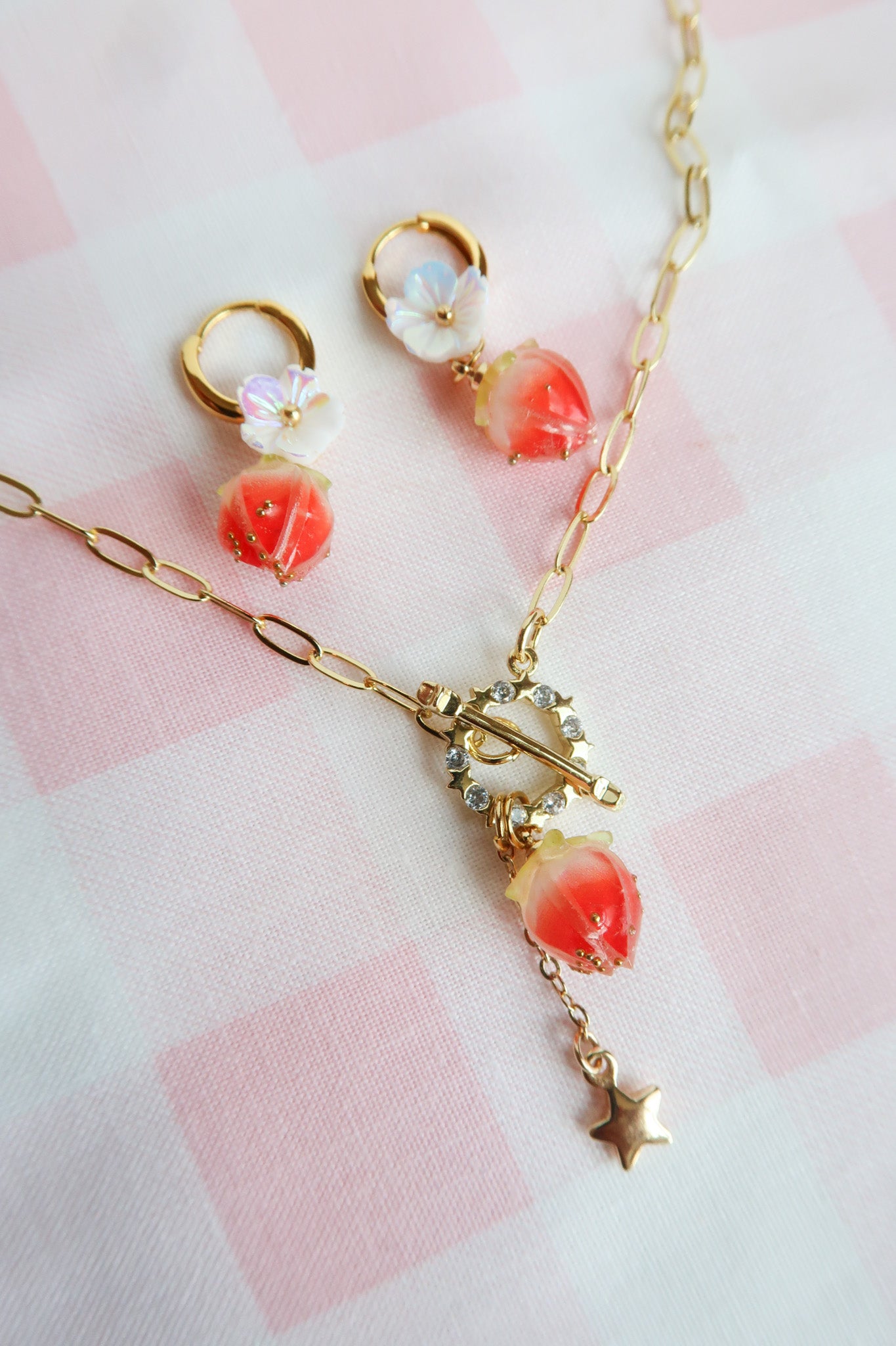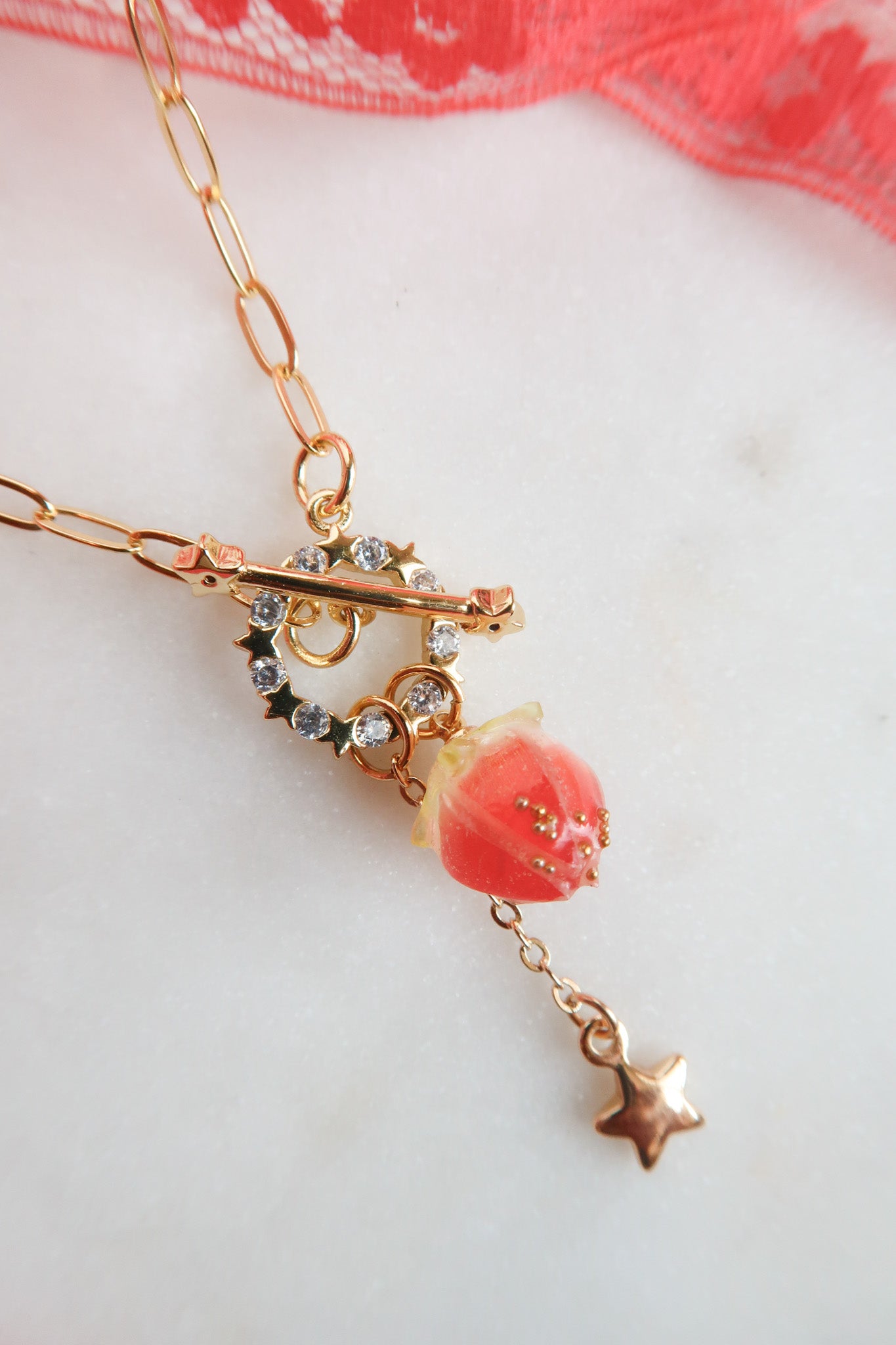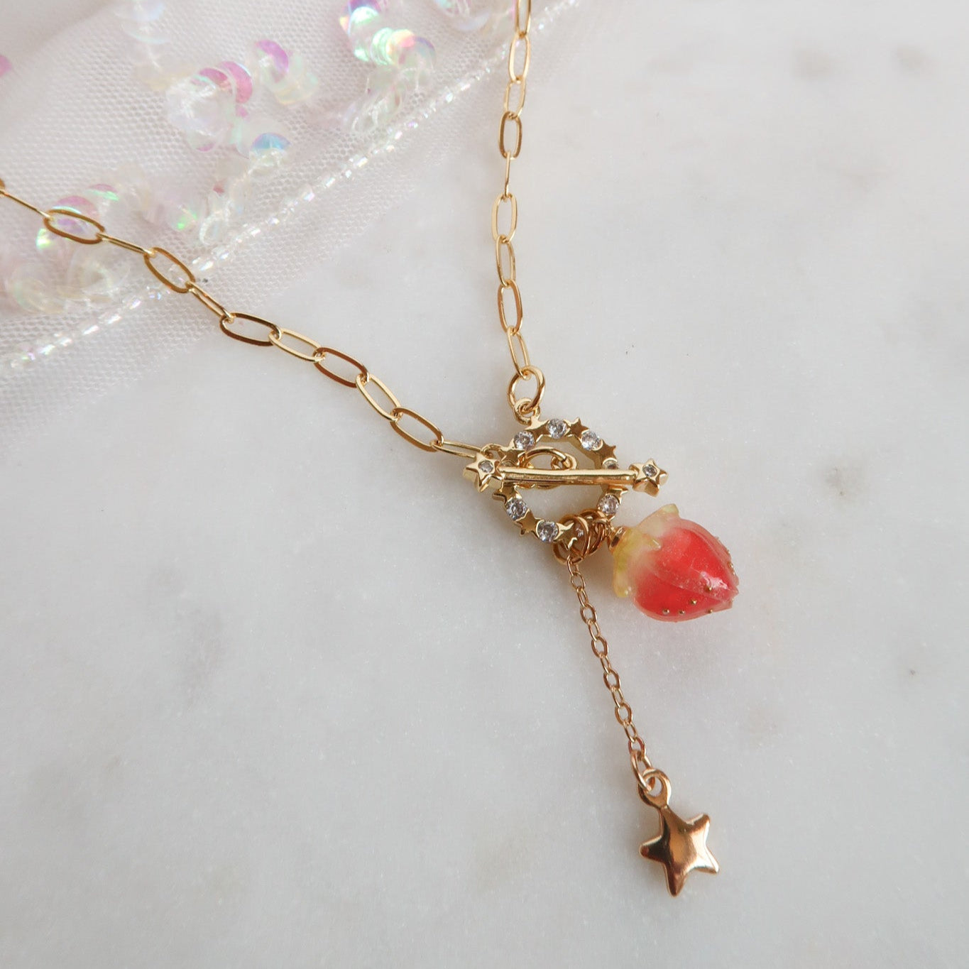 The Starlit Strawberry Fields Necklace is a twilight stroll through a field of dreams, where strawberry charms glimmer beneath a sky full of tiny stars. A starry-detailed toggle and a delicate dangling star add a touch of celestial wonder, turning every movement into a walk of magic. This necklace captures the bittersweet joy of sweet evenings, fleeting moments of wonder, and the soft ache of nostalgia, perfect for hearts that crave whimsy and the poetry of everyday moments.