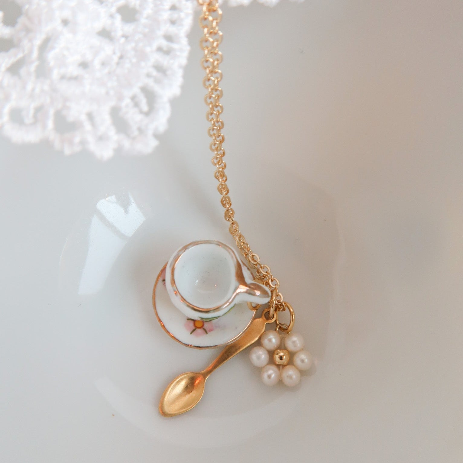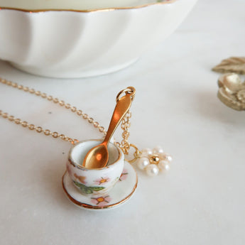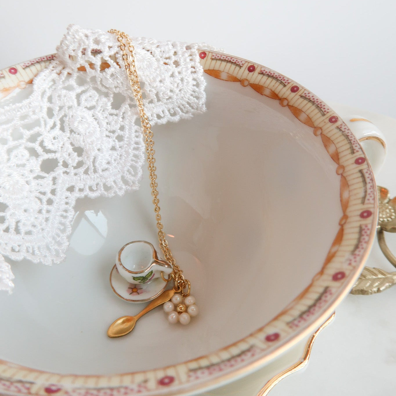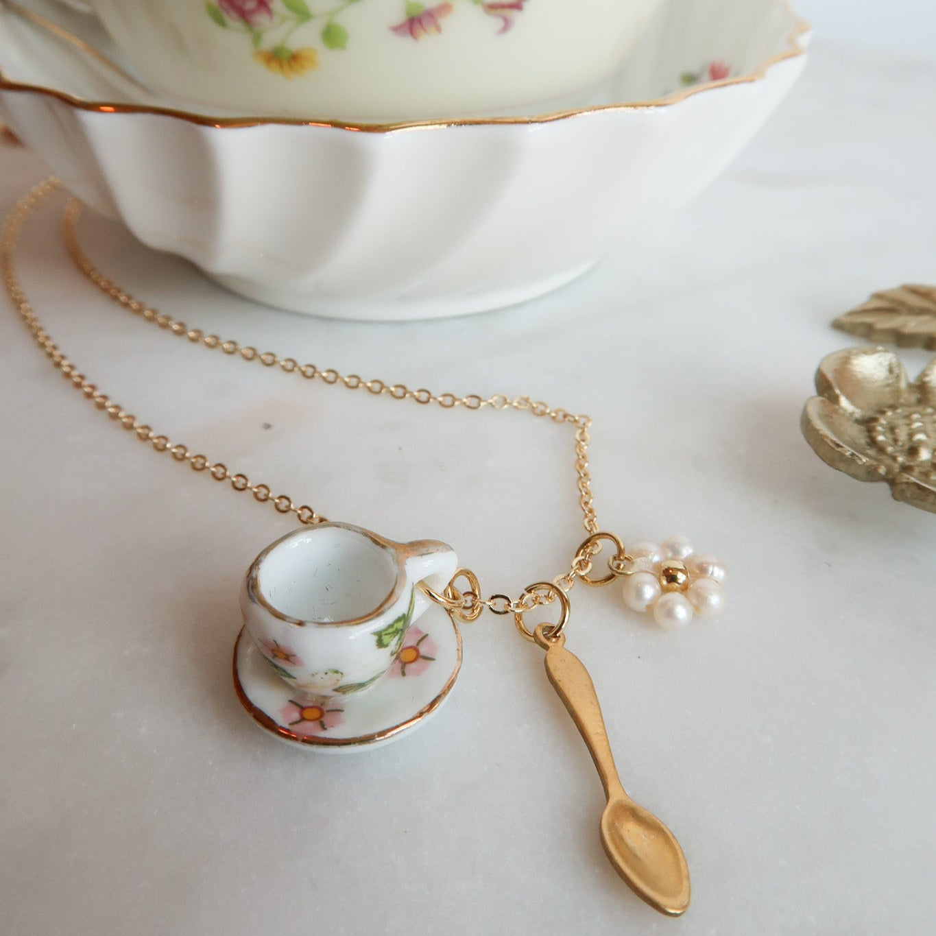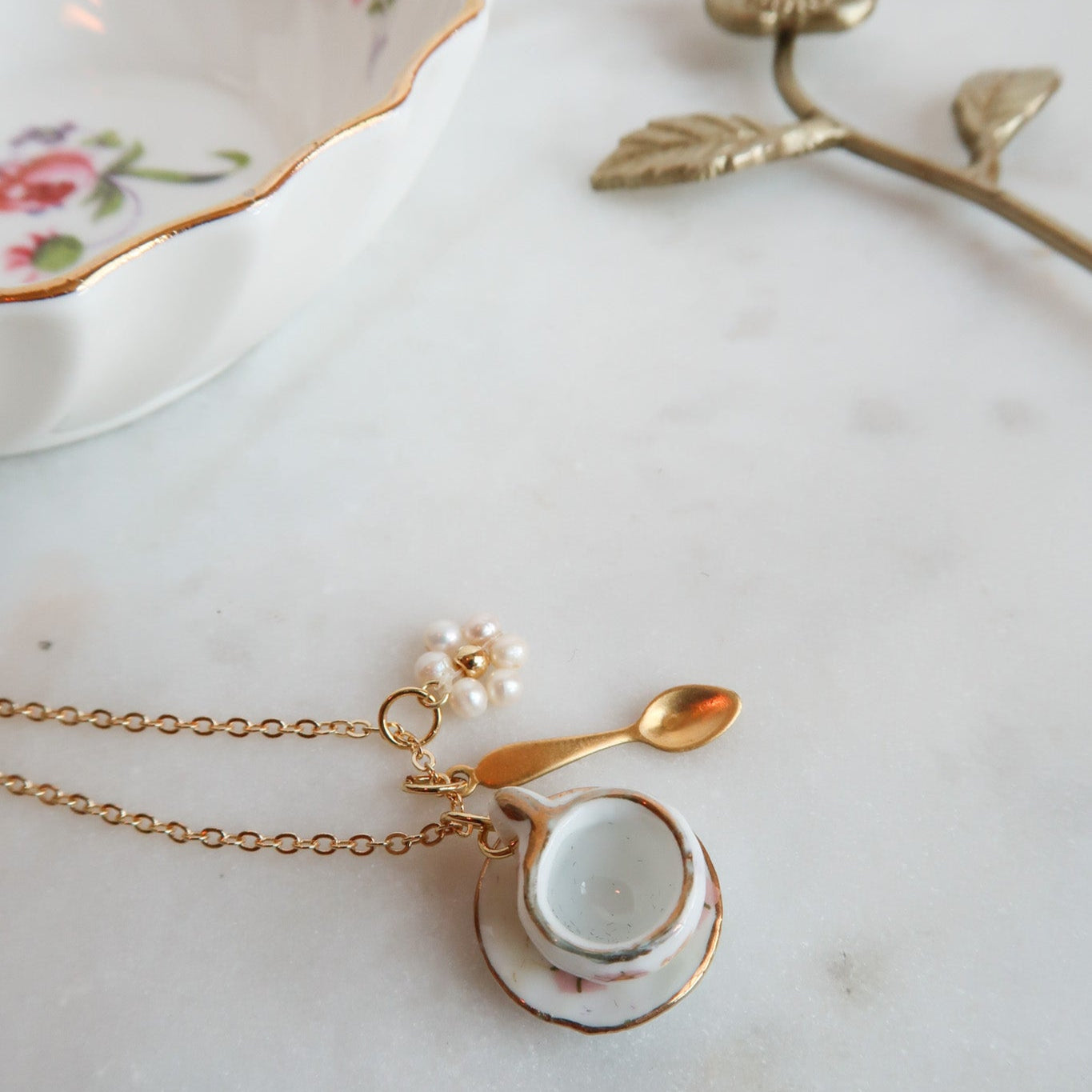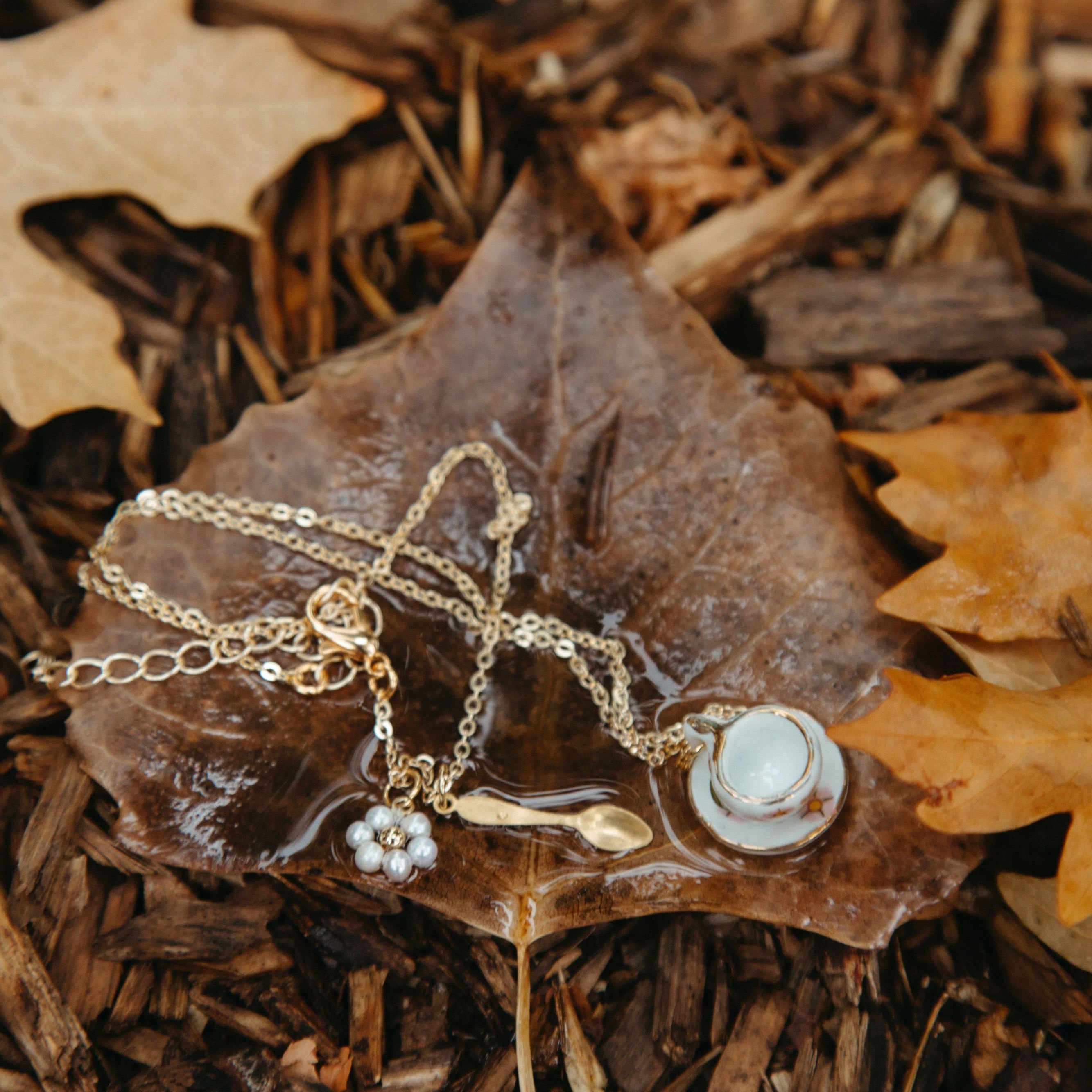 The Spot of Tea Necklace is a delicate ode to cozy rituals and fleeting daydreams, crafted with a ceramic celestial teacup, a miniature spoon, and a pearl flower charm. Like a storybook scene steeped in warmth, this whimsical charm necklace captures the magic of quiet mornings, shared laughter over tea, and the sweetness of slowing down to savor life’s simplest joys. Perfect for dreamers, romantics, and lovers of everyday enchantment, Spot of Tea is a wearable keepsake of comfort, imagination, and gentle beauty.