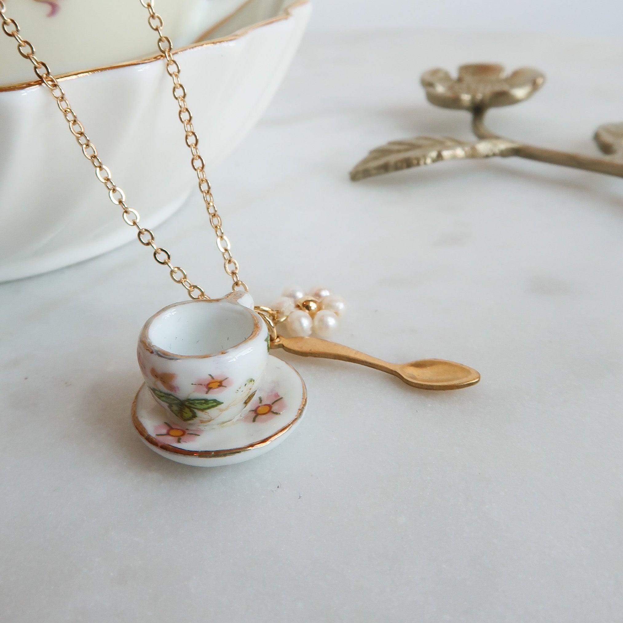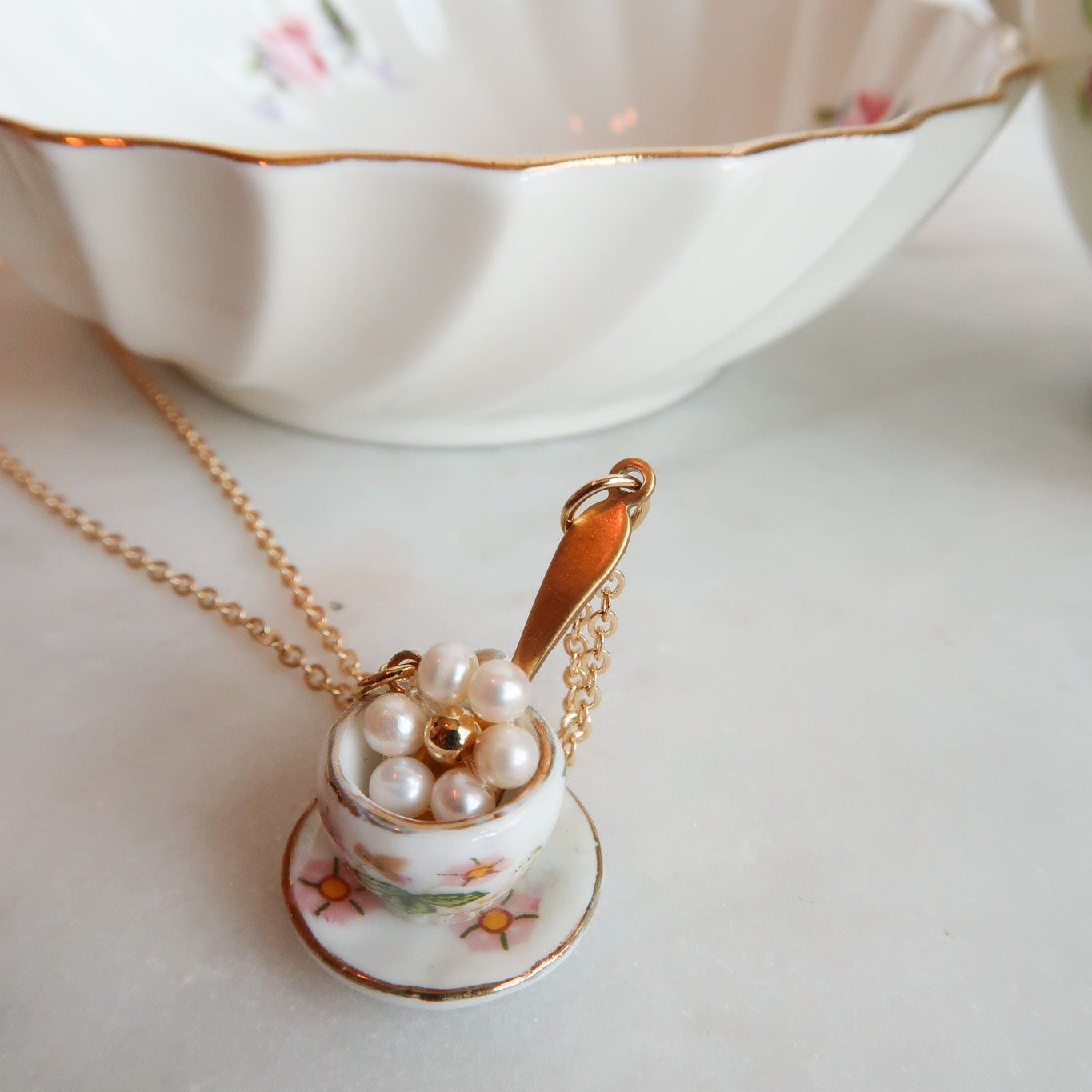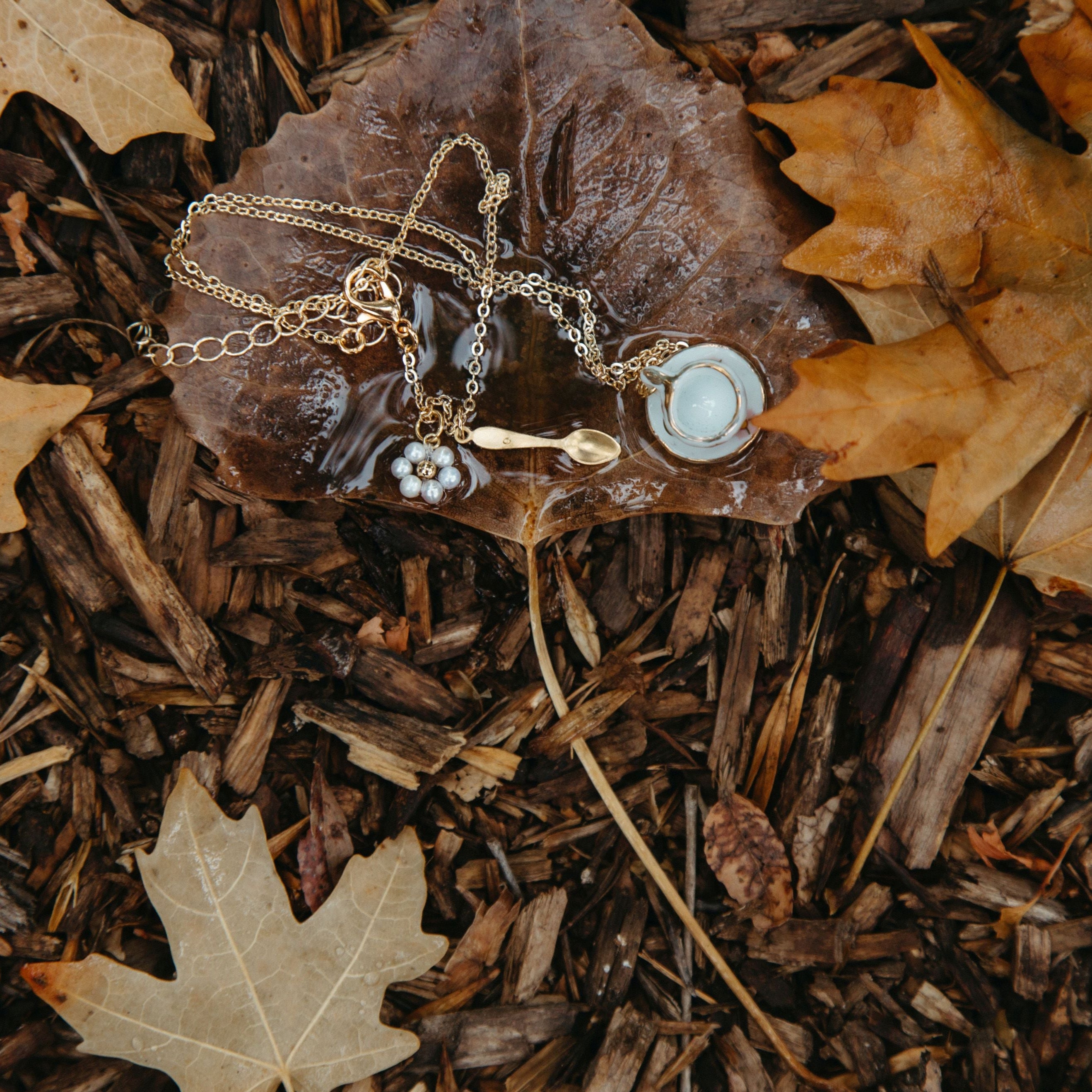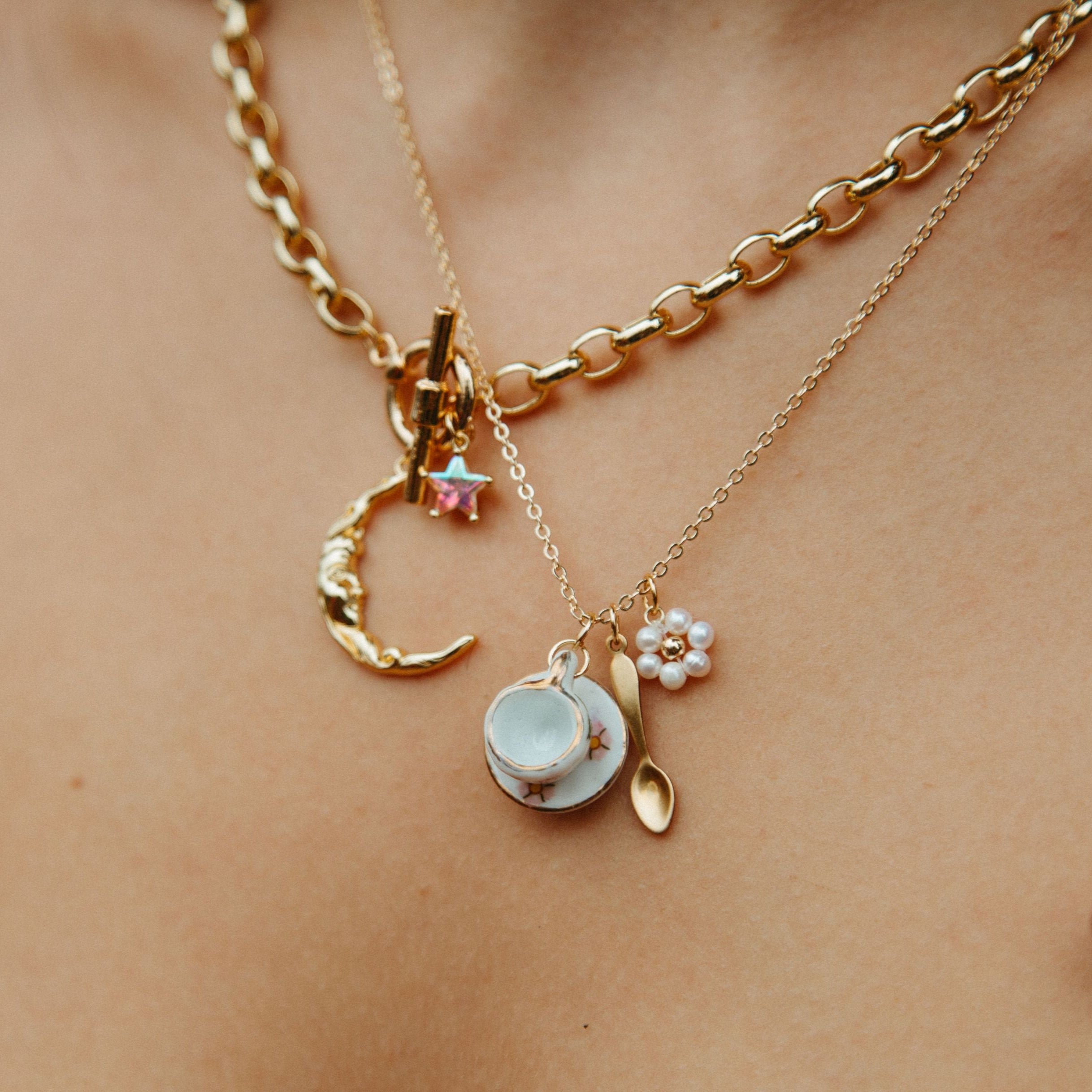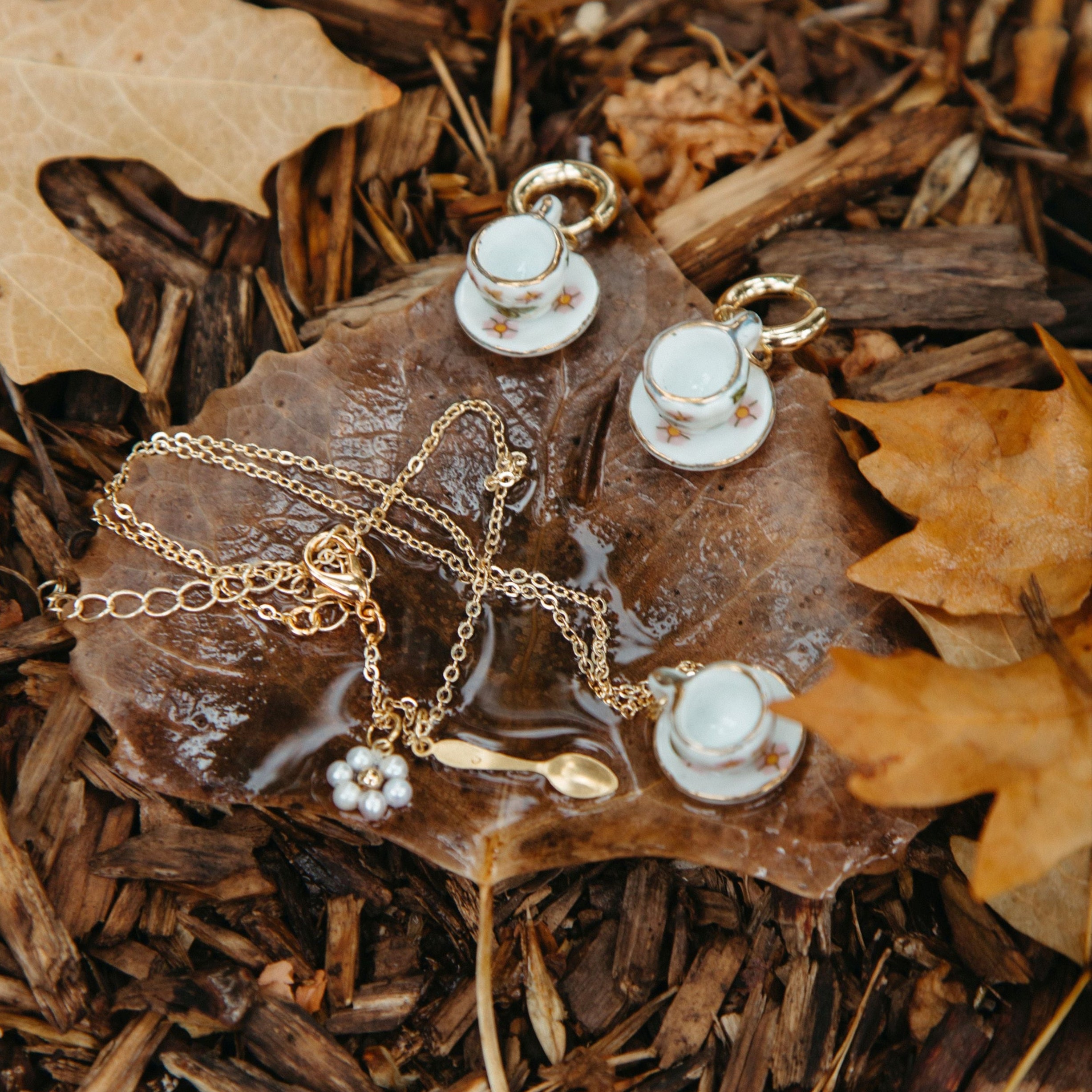 The Spot of Tea Necklace is a delicate ode to cozy rituals and fleeting daydreams, crafted with a ceramic celestial teacup, a miniature spoon, and a pearl flower charm. Like a storybook scene steeped in warmth, this whimsical charm necklace captures the magic of quiet mornings, shared laughter over tea, and the sweetness of slowing down to savor life’s simplest joys. Perfect for dreamers, romantics, and lovers of everyday enchantment, Spot of Tea is a wearable keepsake of comfort, imagination, and gentle beauty.