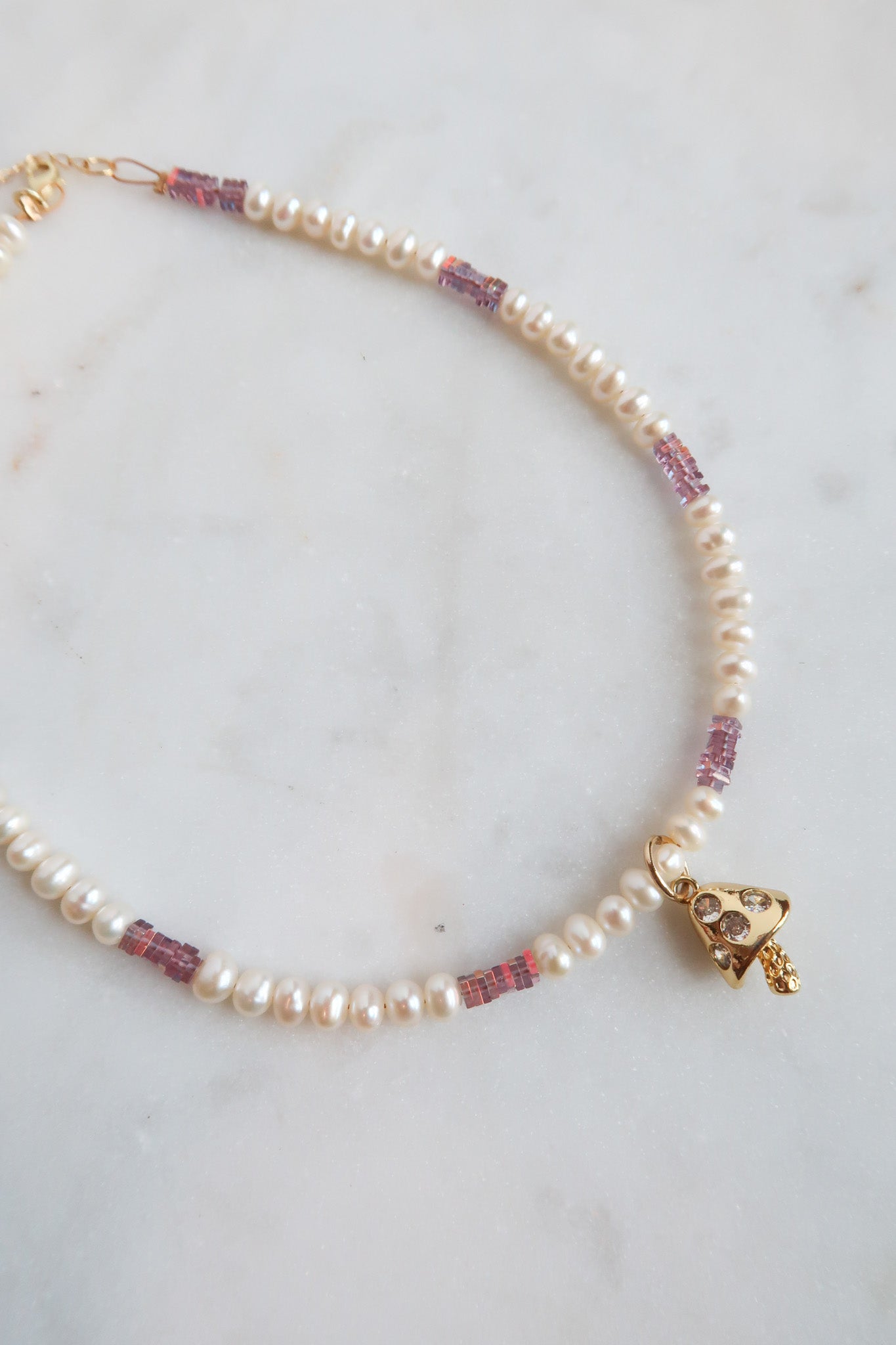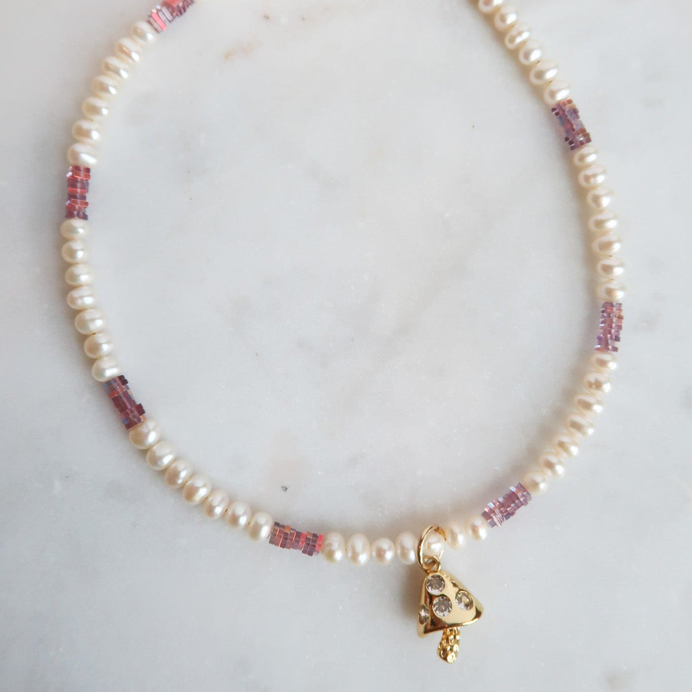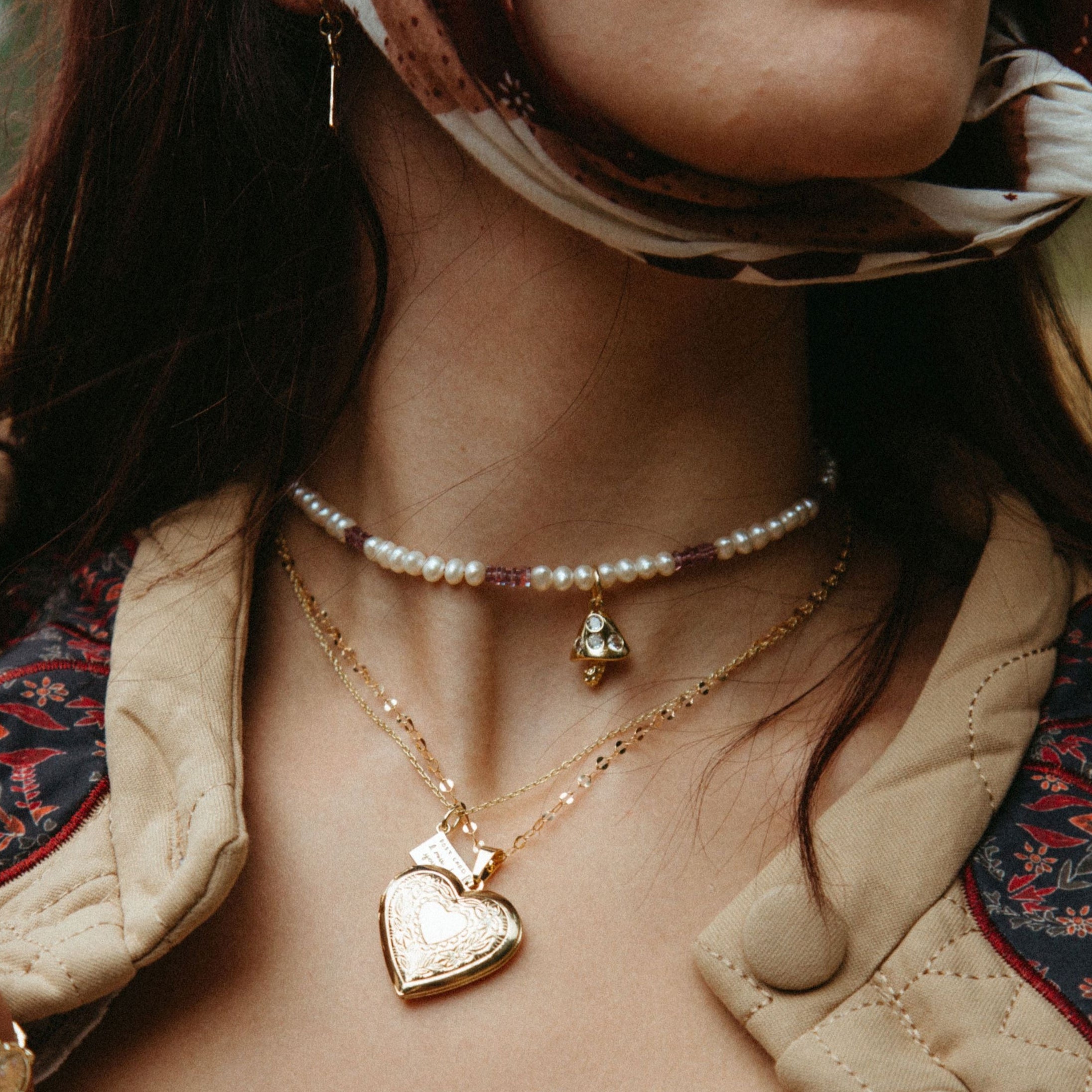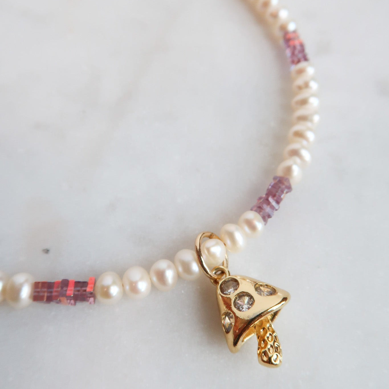 The Meadow Remembers Necklace is a dreamy tribute to nature’s quiet magic, featuring a delicate mushroom charm strung along pearls with iridescent purple beads that shimmer like twilight fields. Whimsical and nostalgic, this pearl mushroom necklace feels like wandering through wildflower meadows where every breeze carries a memory and every bloom whispers a story. Designed for dreamers, wanderers, and lovers of enchanted details, The Meadow Remembers is a keepsake of beauty, growth, and the gentle reminder that the earth always holds our footsteps.