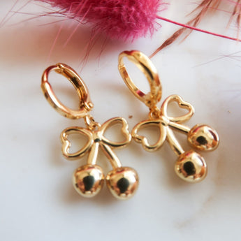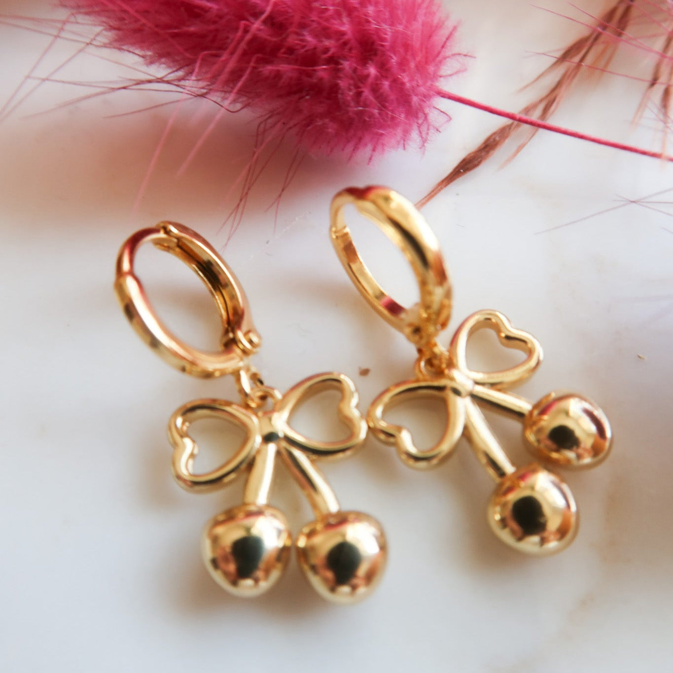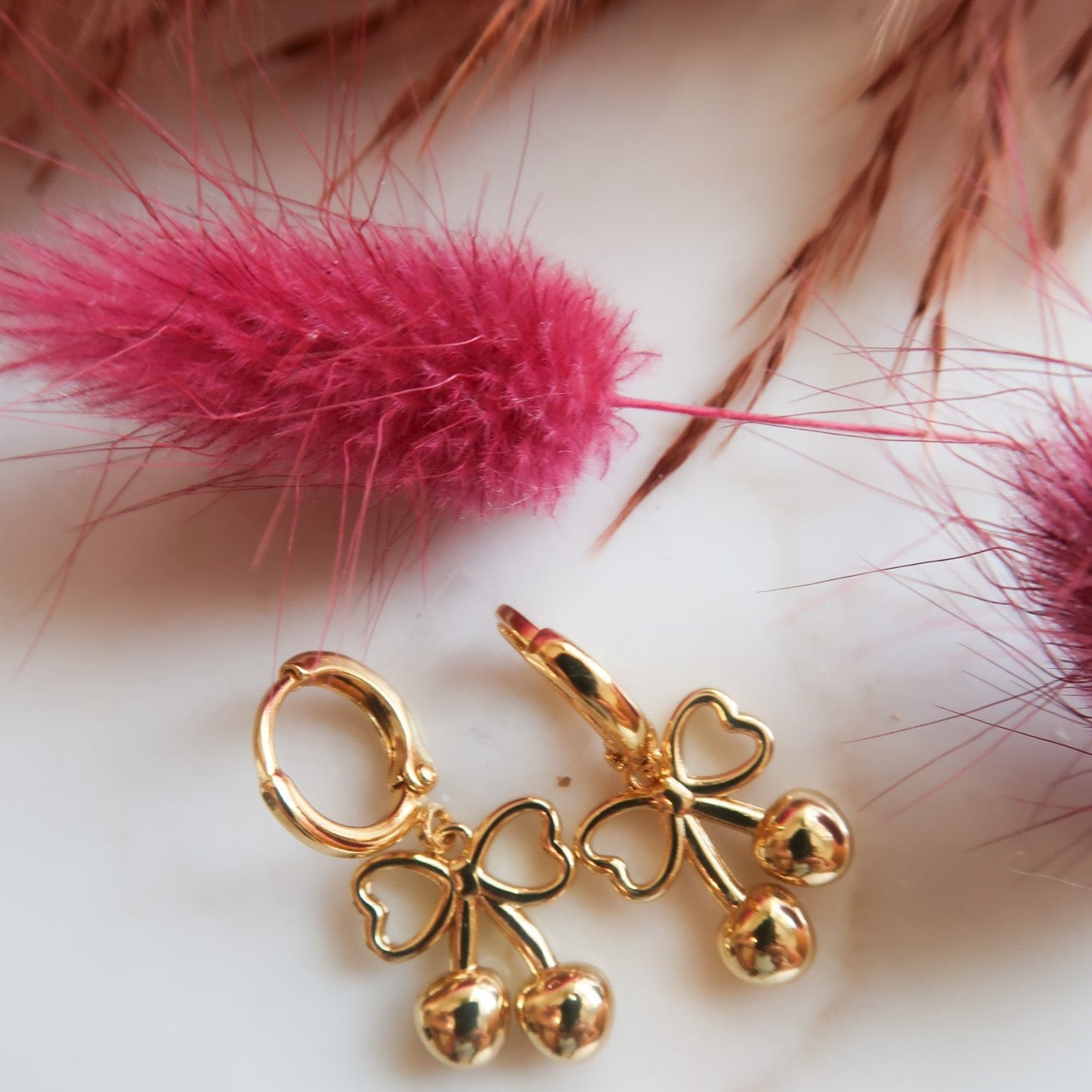 The Forgotten Summer earrings are a sweet echo of sun-drenched days and whispered secrets. Featuring two delicate cherry bows that dance on gold huggies, they bring a playful charm to everyday elegance. Each bow tells a story of summers gone by, where laughter and longing intertwine, capturing moments we wished to embrace but somehow let slip away.