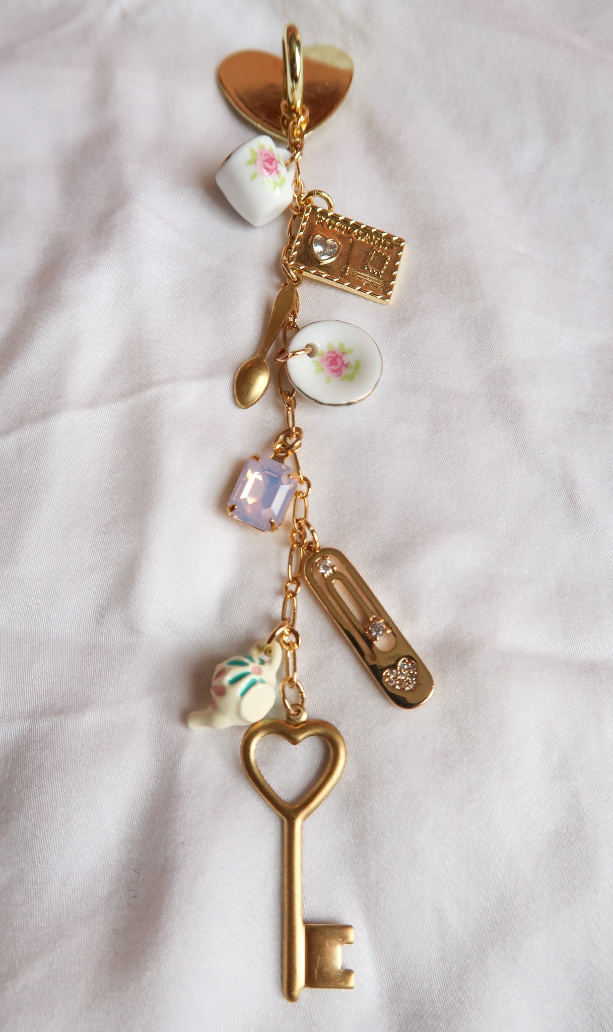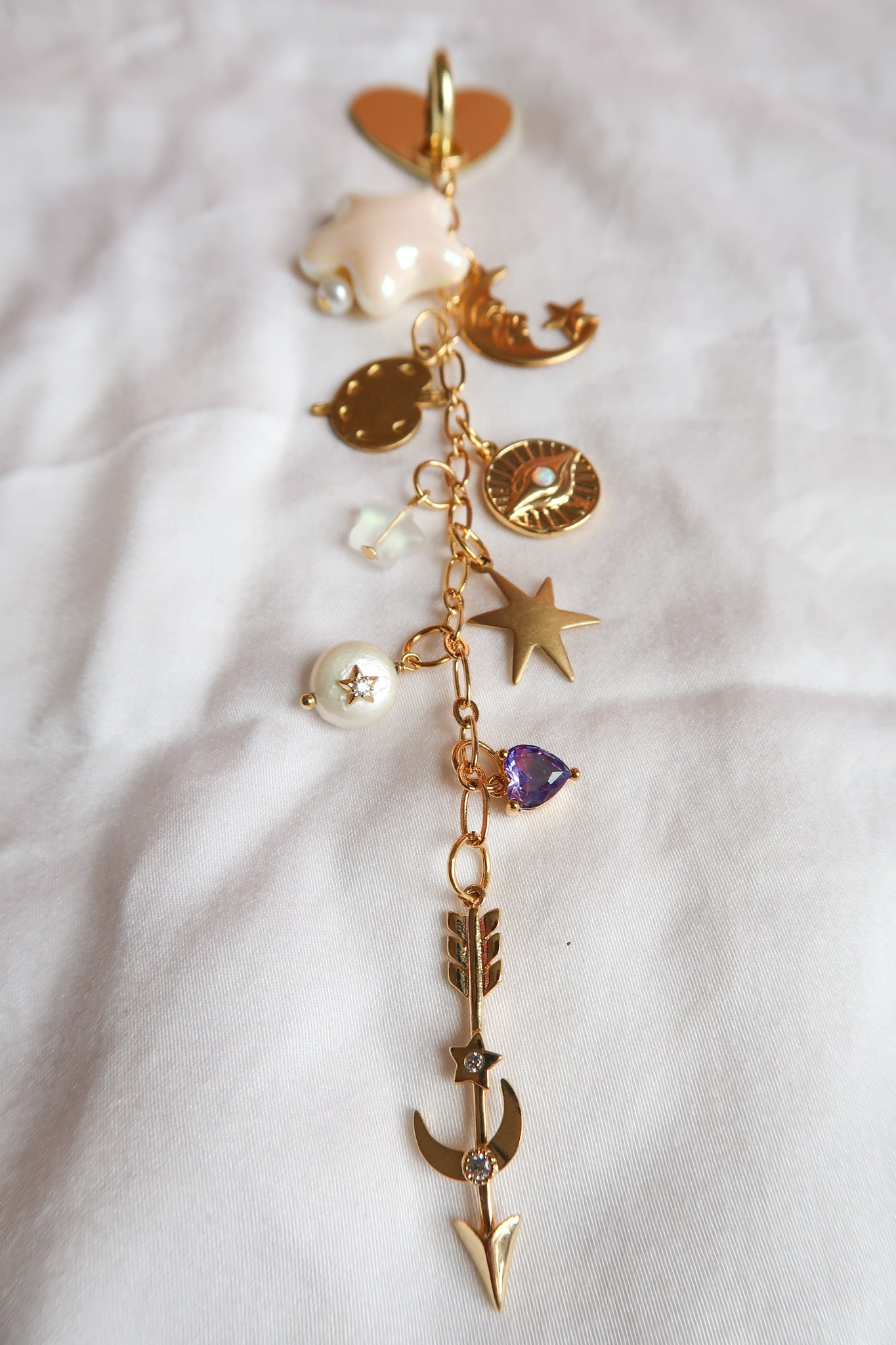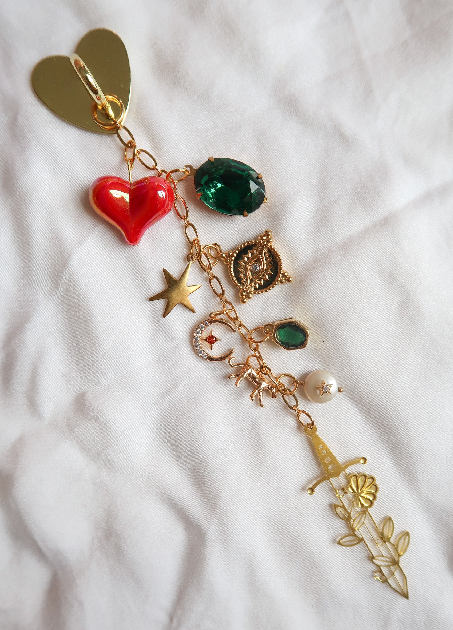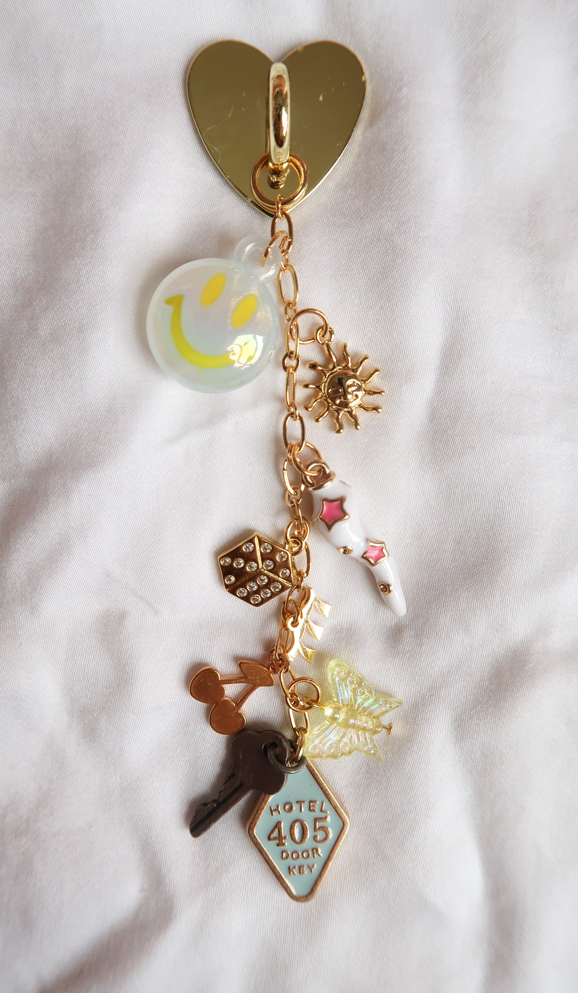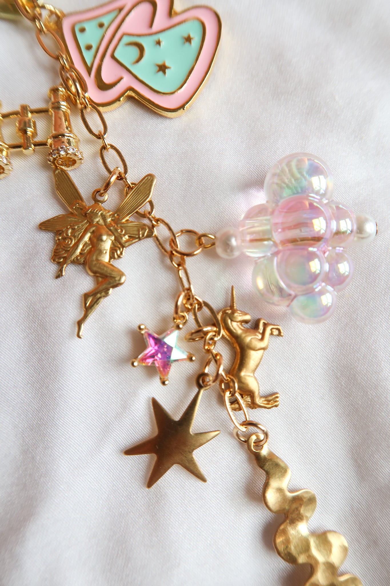 - 8-9 charms on each kindle charm varying between beads, gold plated, brass, and/or gold filled charms