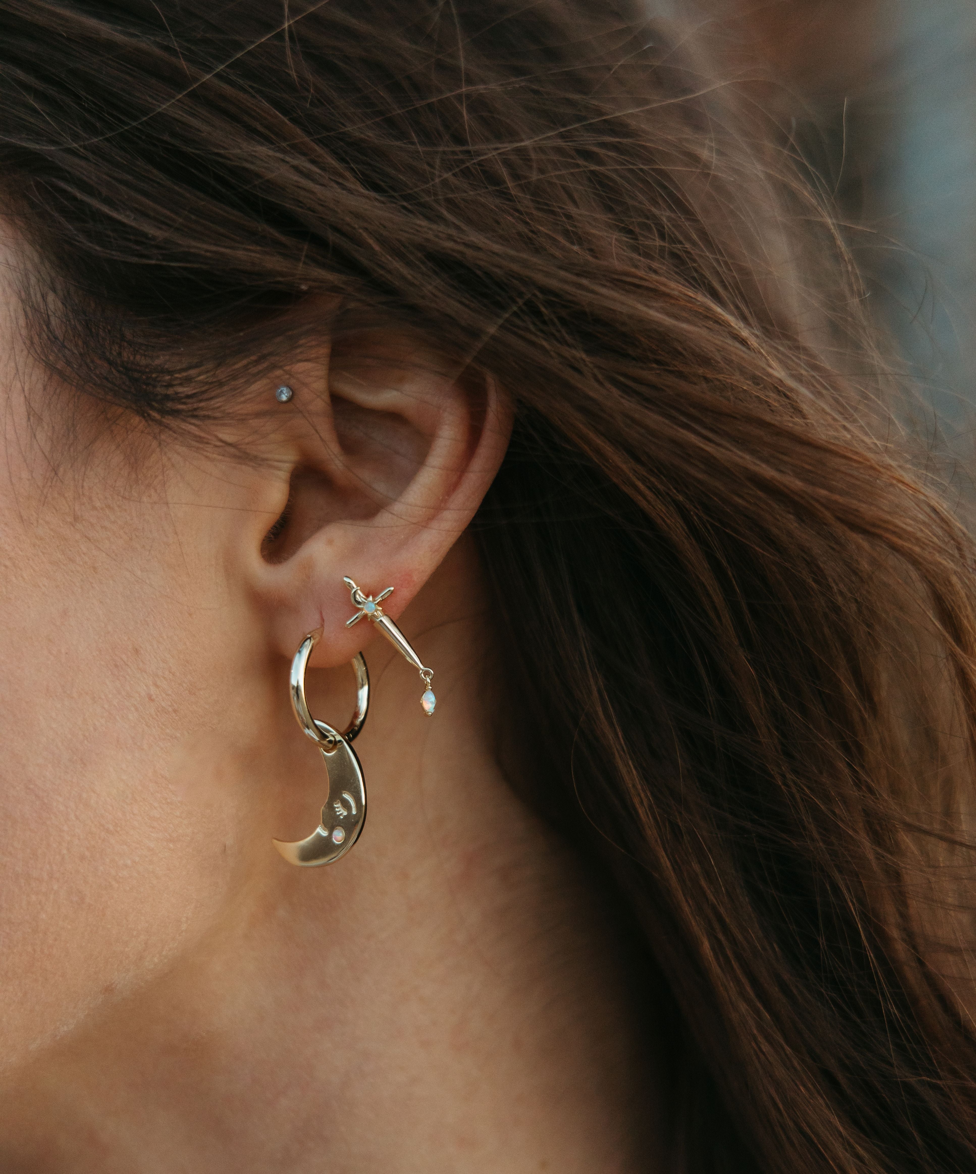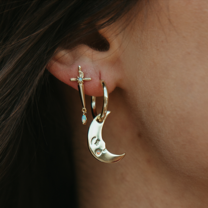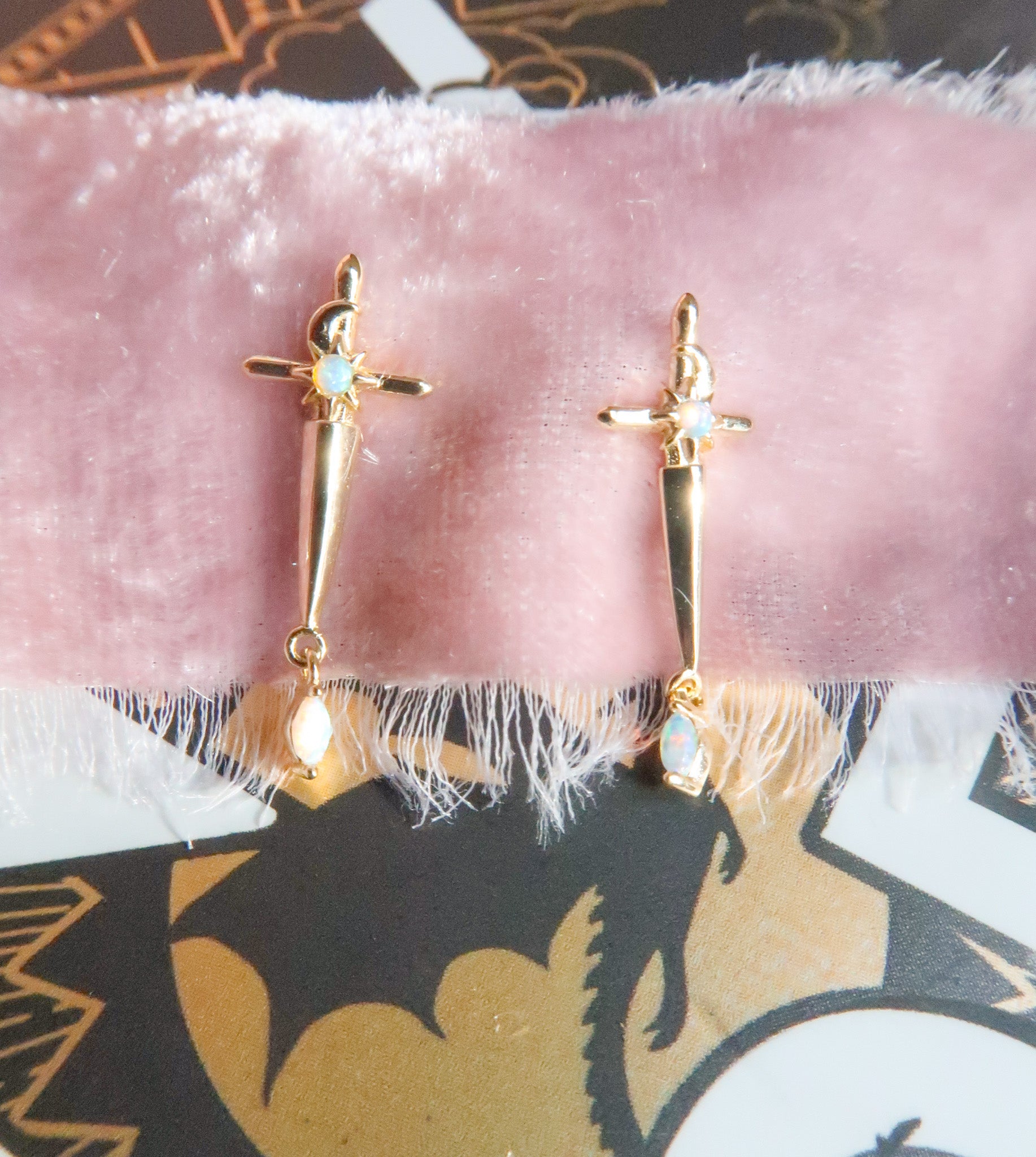 Violet’s Daggers Earrings are a tribute to bravery and the sharp beauty of survival, inspired by Rebecca Yarros’s Fourth Wing series and the fierce heart of a girl who learned to fight anyway. Featuring celestial pommel dagger earrings finished with luminous opal drops, these fantasy book earrings balance softness and strength in every detail. The opal glimmers like hidden power beneath fragile skin, while the delicate celestial accents feel like stars guiding you through battle and becoming. Designed for romantasy readers, dragon riders at heart, and sentimental souls who carry both courage and vulnerability. These whimsical dagger earrings are a reminder that resilience can be both fierce and soft.