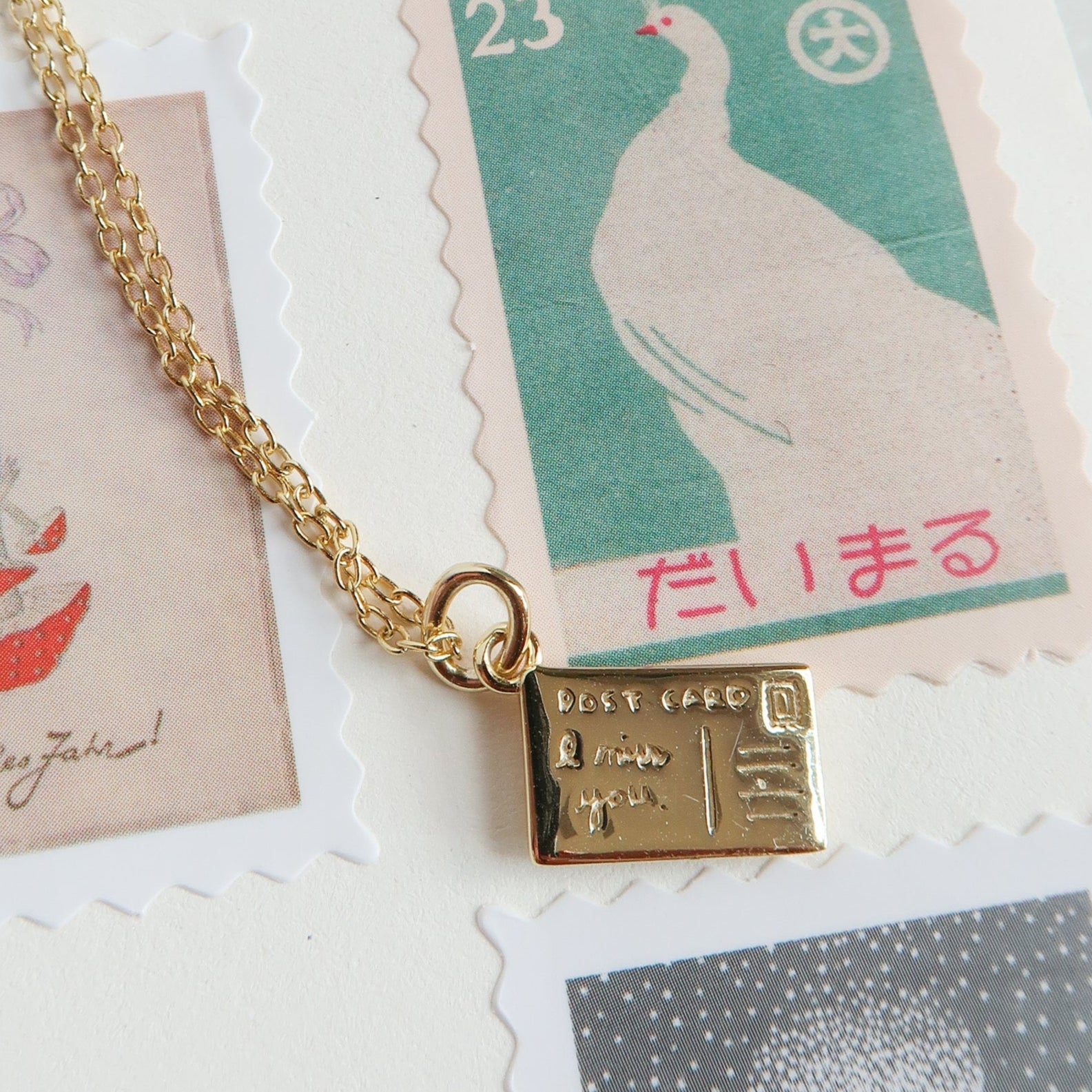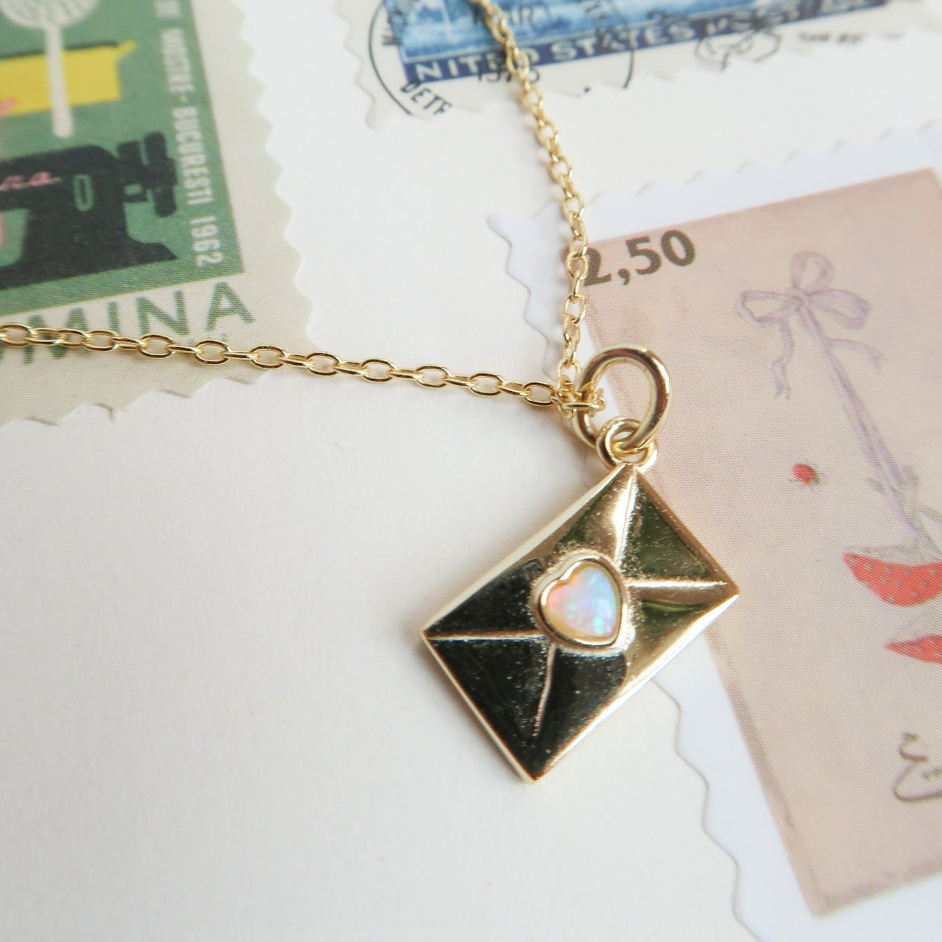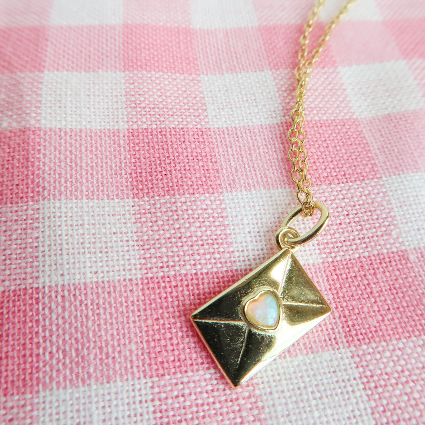 - 14k Gold Plated Sterling Silver Reversible Love Letter Necklace: One side with a Opal Heart Seal and the other side with an engraved 'I miss you' postcard: 14" with 3" adjuster links