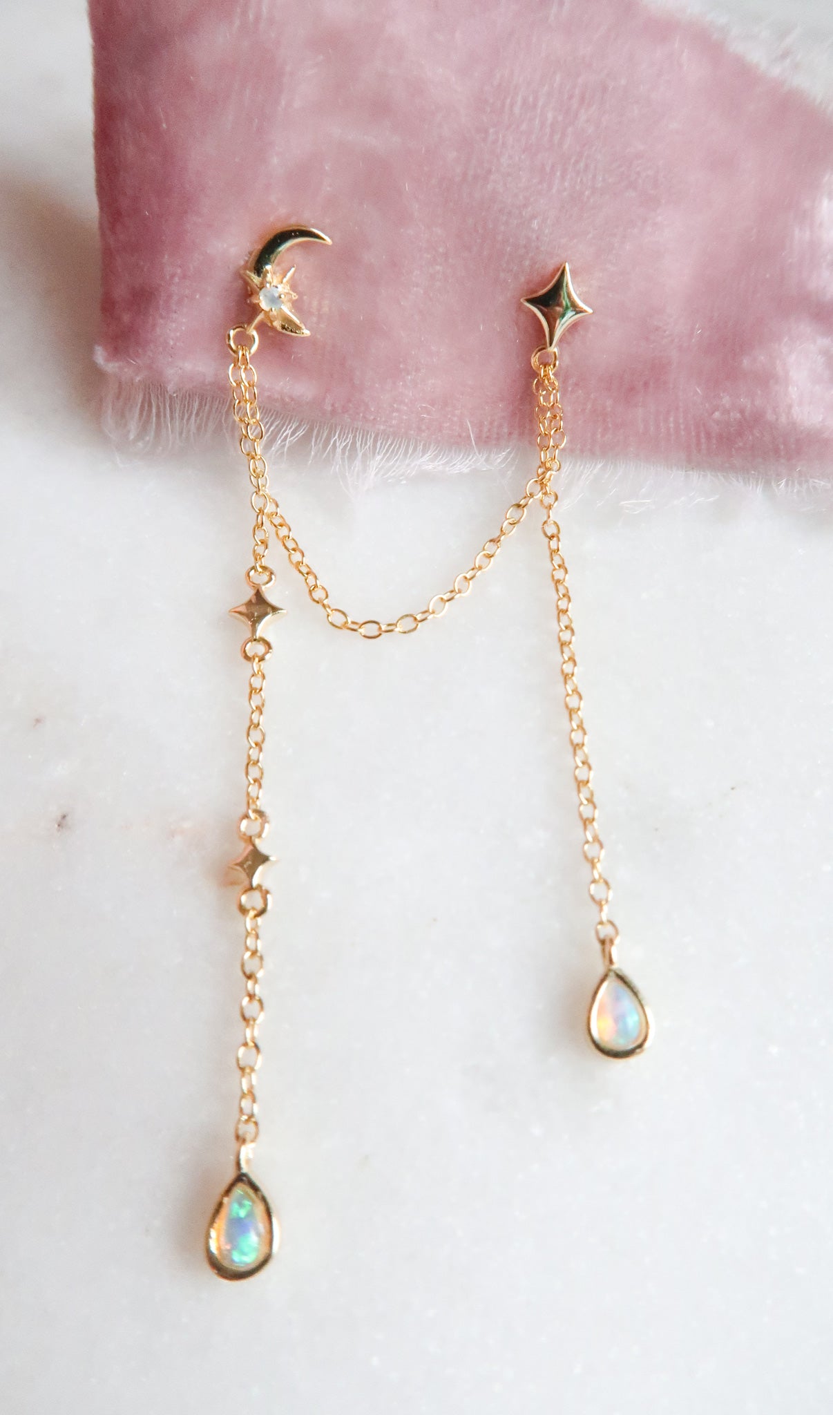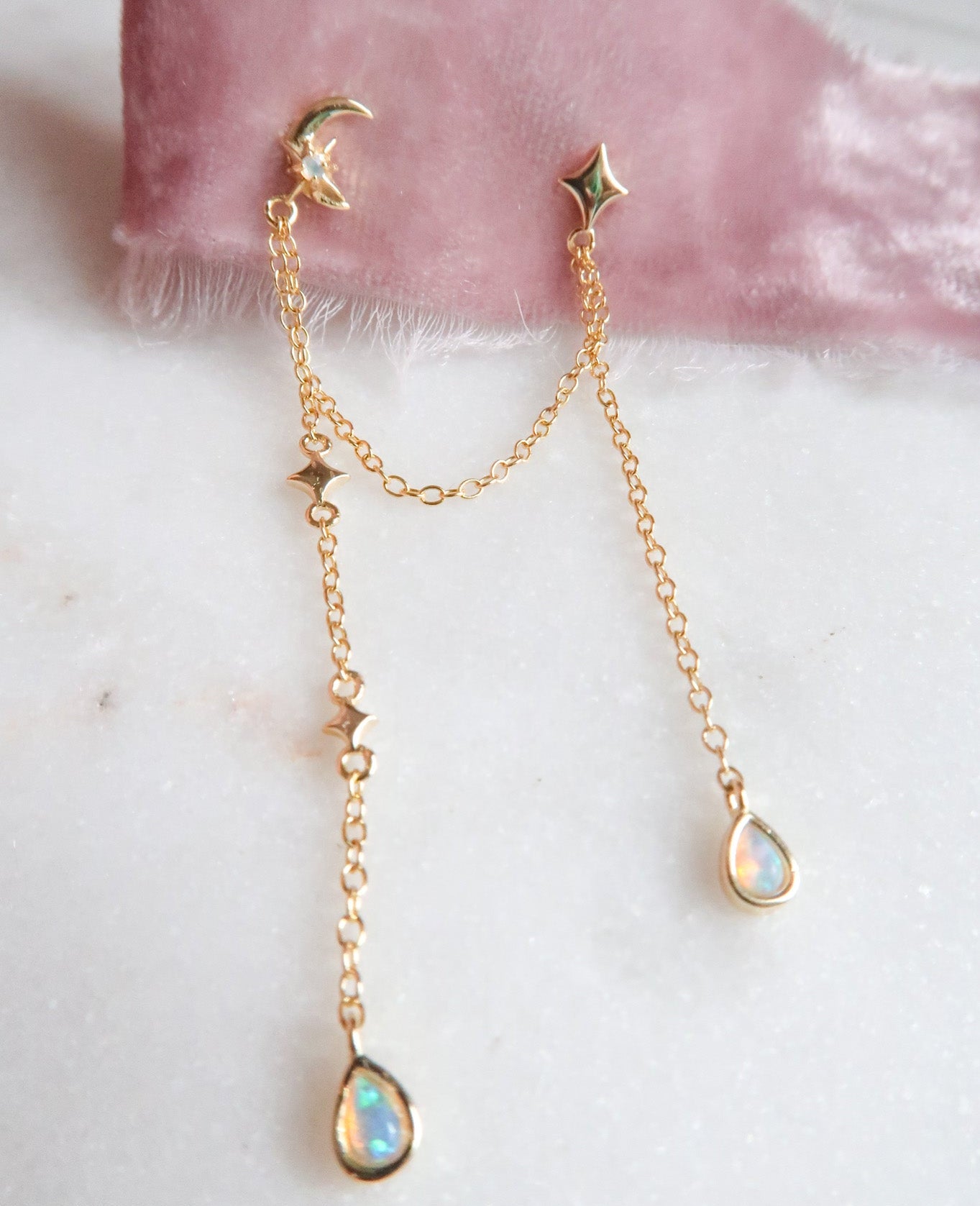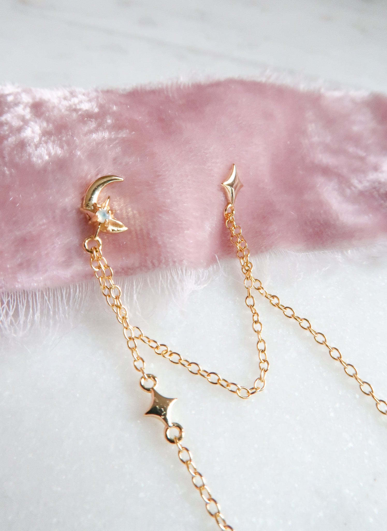 The Starfall Double Piercing Earrings are a quiet tribute to the breathtaking Starfall scene from Sarah J. Maas’s A Court of Thorns and Roses, where falling stars fly like whispered wishes across the night sky. Featuring a delicate moon and star stud design connected by a gold chain with glittering opals dangling from the ends, these celestial earrings capture the feeling of standing beneath a sky full of wonder and possibility. These earrings capture fleeting magic, tender moments, and the bittersweet beauty of stories that stay with you long after the last page. Perfect for romantasy readers, celestial jewelry lovers, and sentimental souls who carry stardust in their hearts. Starfall is a dreamy double piercing earring set made for nights that feel like forever.