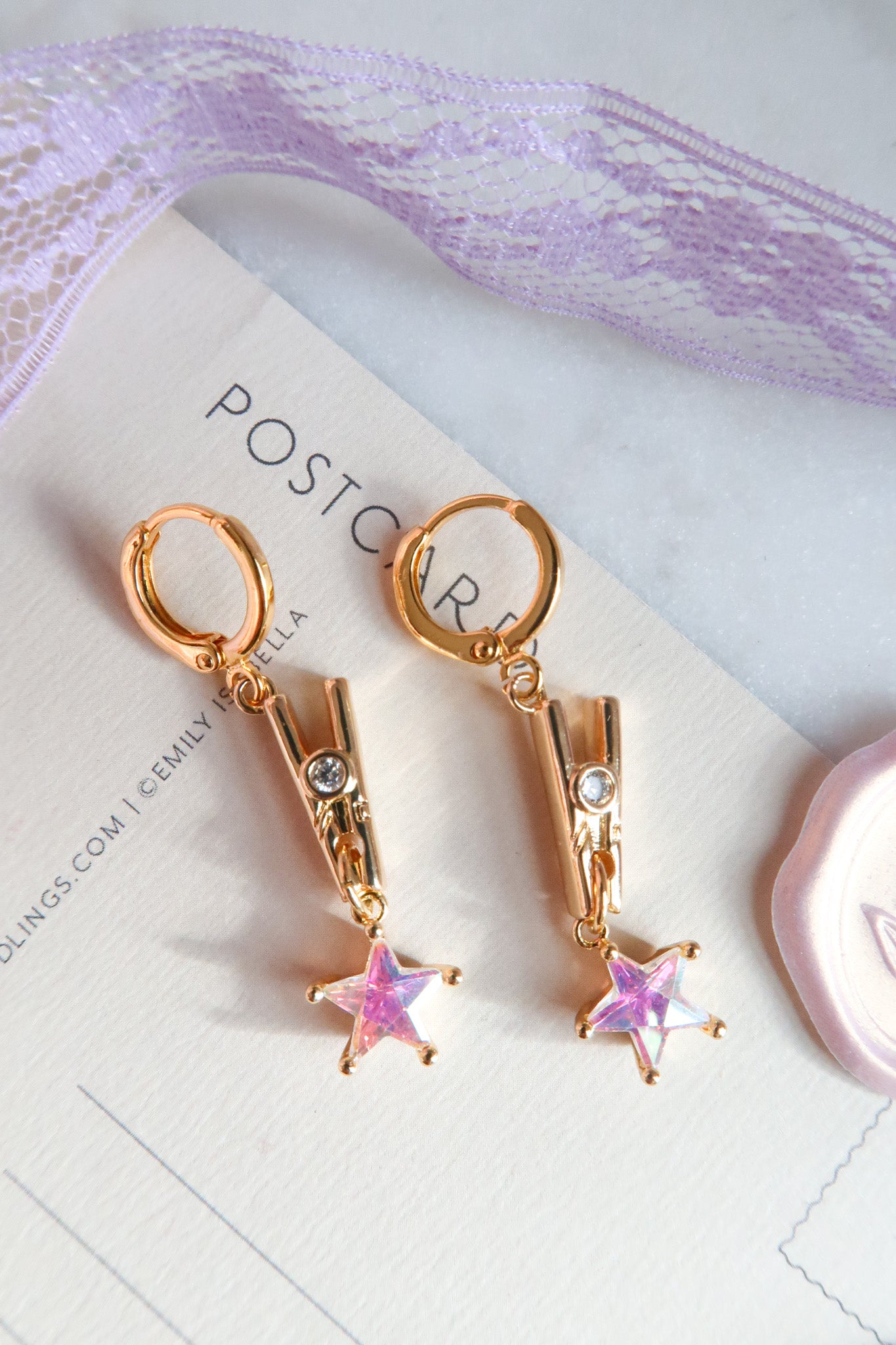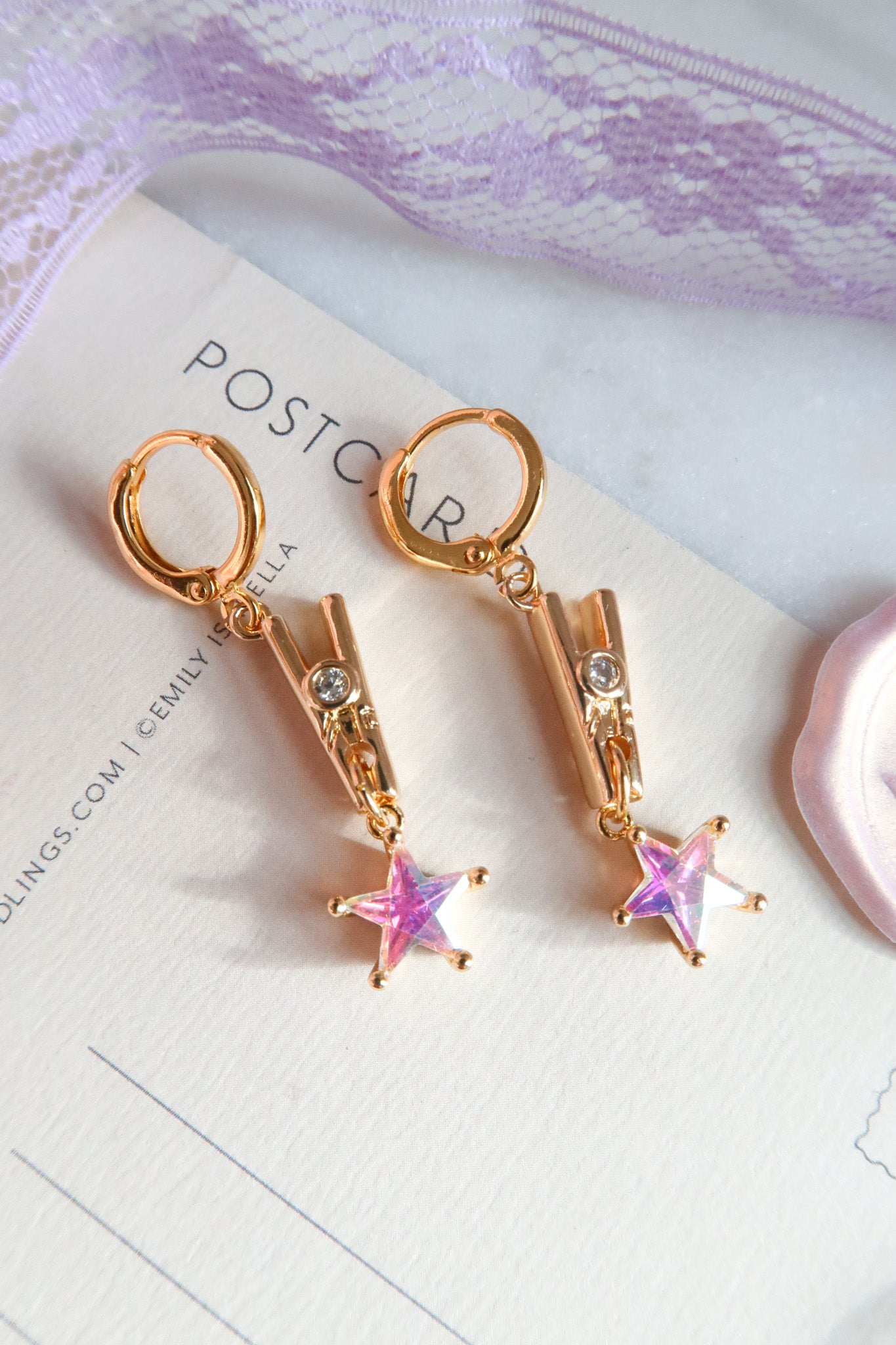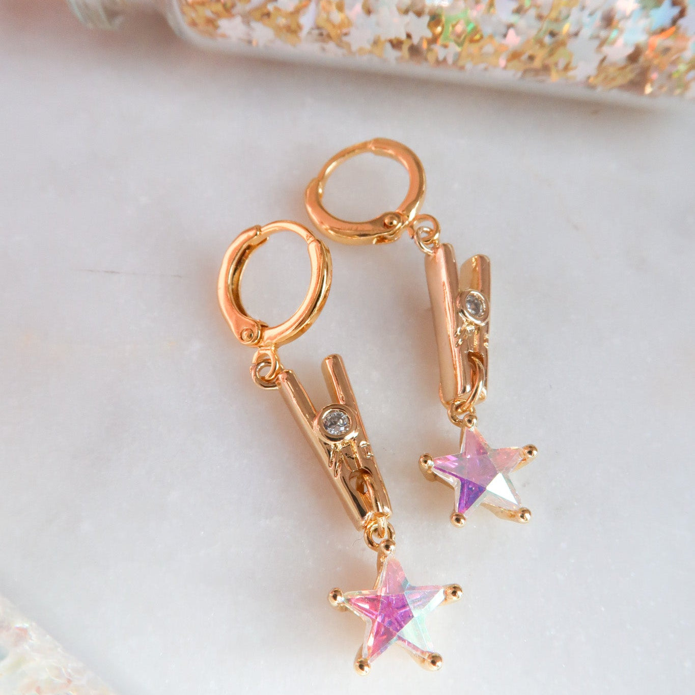 Where We Hung the Stars Huggie Earrings capture the magic of a night spent pinning dreams along the skyline. Tiny clothespin charms cradle iridescent stars that shimmer in the light, like constellations caught between fingertips. These earrings are for the dreamers who collect wonder in small moments, who remember how it felt to reach for light and leave traces of it behind. Whimsical, playful, and tenderly poetic, Where We Hung the Stars turns everyday gestures into little acts of starlit reverie.